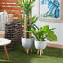 • indoor outdoor planter set features a solid fiber clay and magnesium oxide plant pot on light-colored rubber wood tripod base