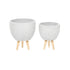 •Contemporary set of planters for outdoor plants was made with ceramic being molded into its unique shape while the rubber wood tripod legs were carefully carved to provide stability and contrast to the ceramic body