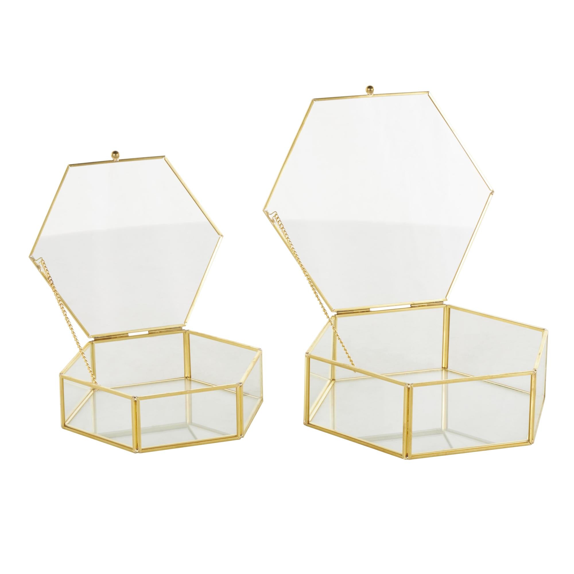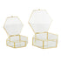 Set of 2 Geometric Clear Glass Hexagon Decorative Jewelry Box with Gold Metal Frame and Chain Accent