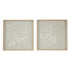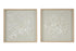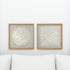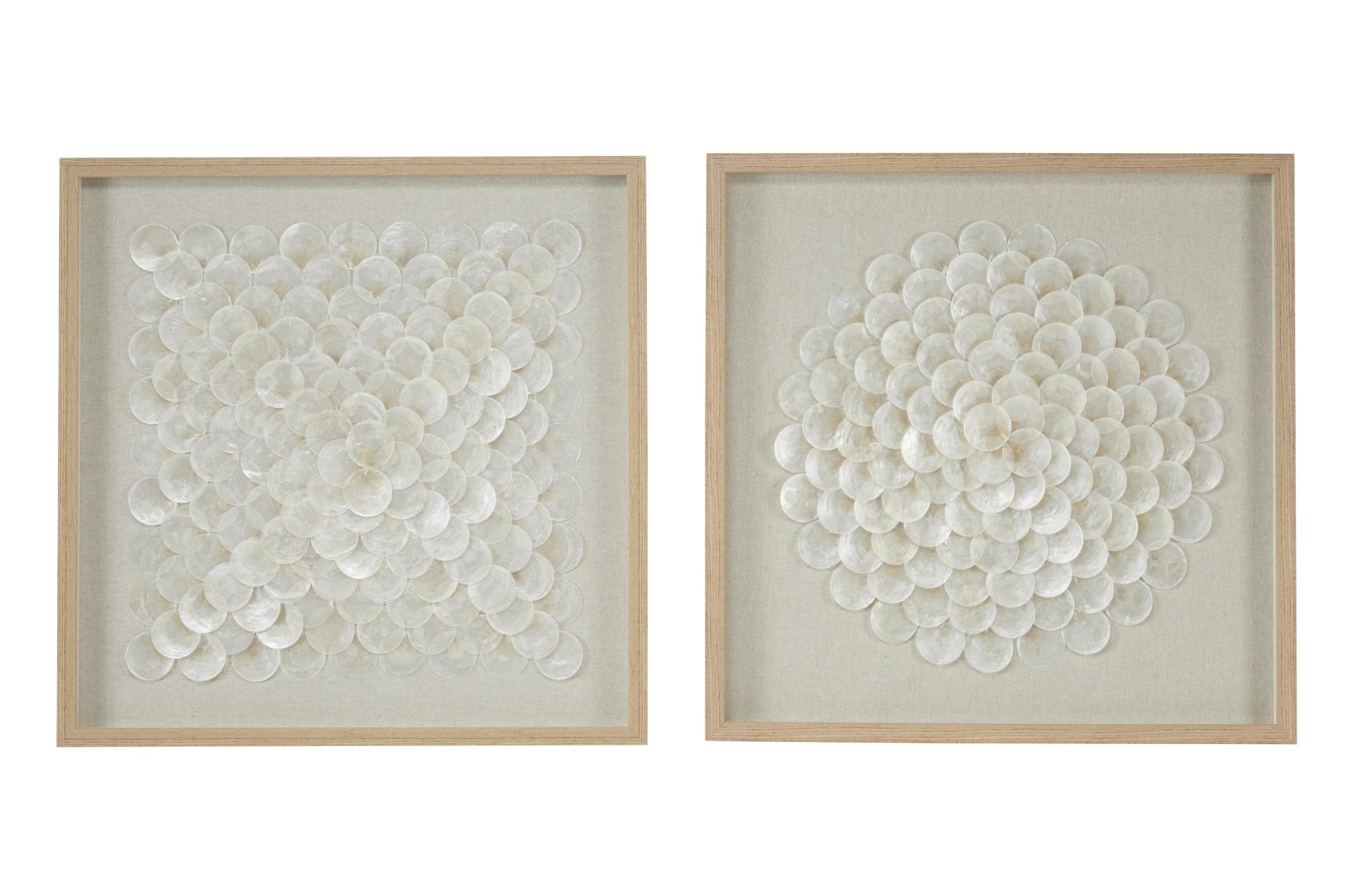 Style the geometric set of 2 wall sculptures in natural-themed living room or bedroom to add charm and elegance. This item ships in 1 carton. Geometric radial and square wall art with textured, wheat linen backs, each with round, white, luminescent seashells, frames are distressed to create a wood-like texture. Due to the handmade nature of this item, no two will be alike, there will be slight differences in shape, size, and color. Can be hung horizontally or vertically using the d-rings; nails and screws not included. Suitable for indoor use only. This item ships fully assembled in one piece. This shell wall decor comes as a set of 2. Coastal style.