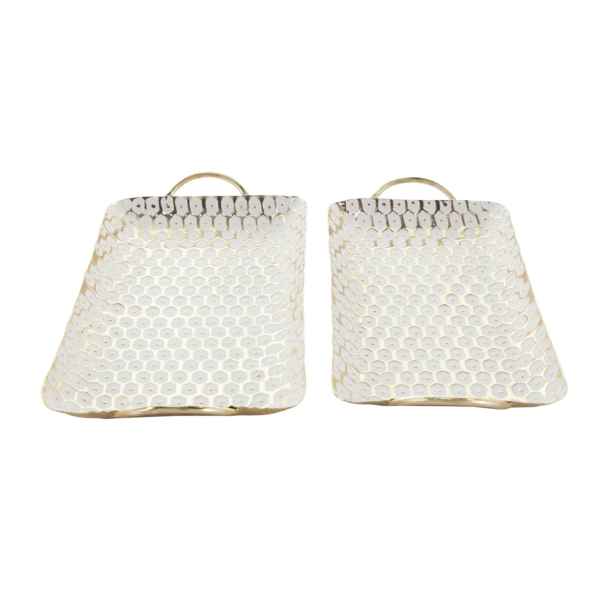 Set of 2 Geometric Gold Metal Geometric Dot Living Room Decor Tray with White Accents