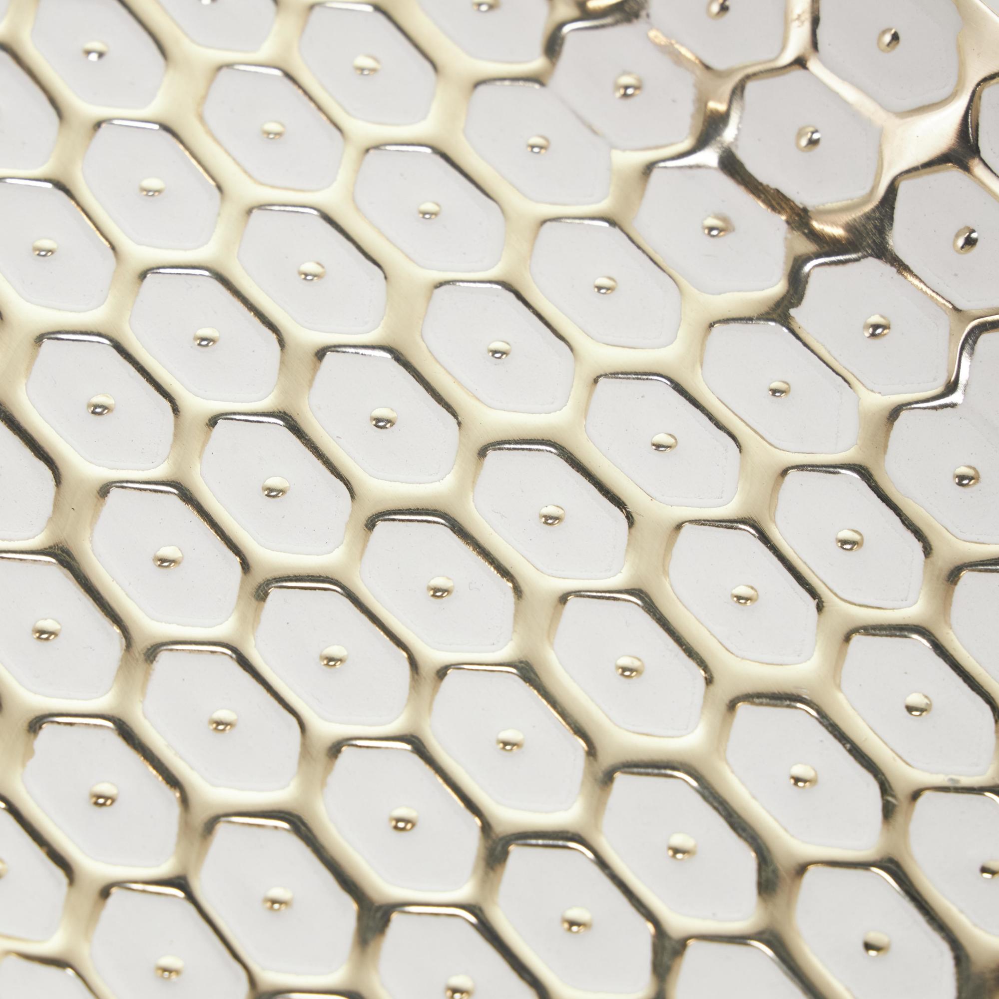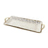 •The polished storage tray features a rectangular shape with rounded edges, adorned with geometric oval-shaped patterns and arched handles