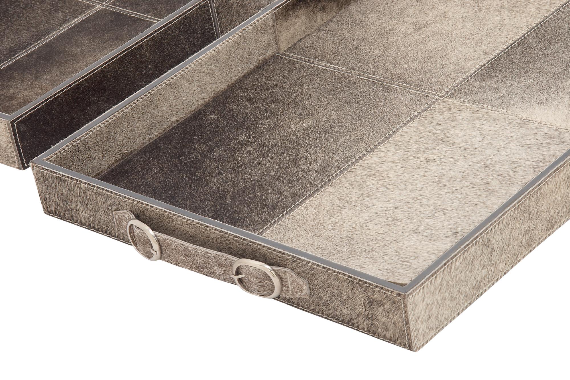 Set of 2 Gray Wooden Handmade Cowhide Living Room Decor Tray with Slot Handles