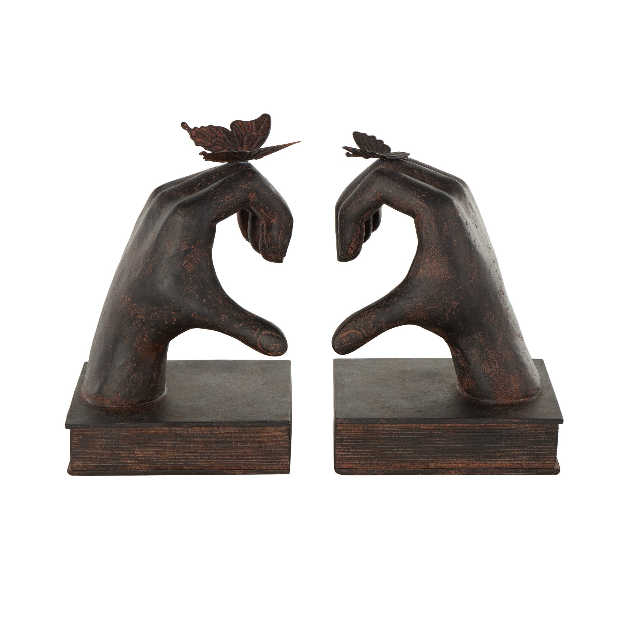 Set of 2 Hands Dark Brown Resin Heart Inspired Decorative Bookends with Butterfly and Copper Accents