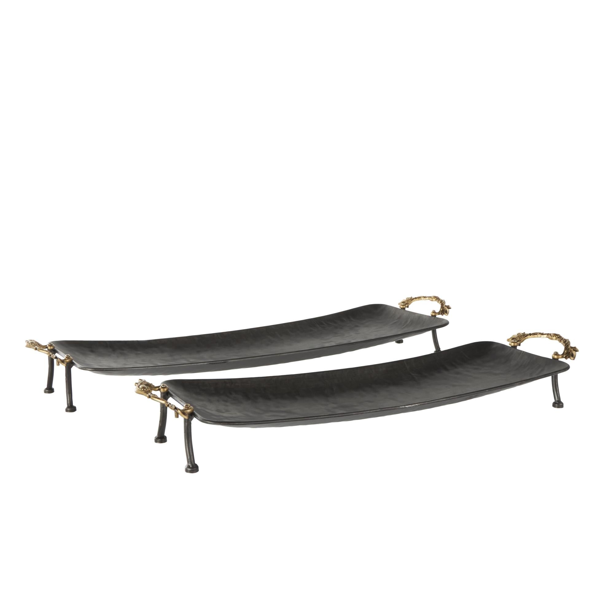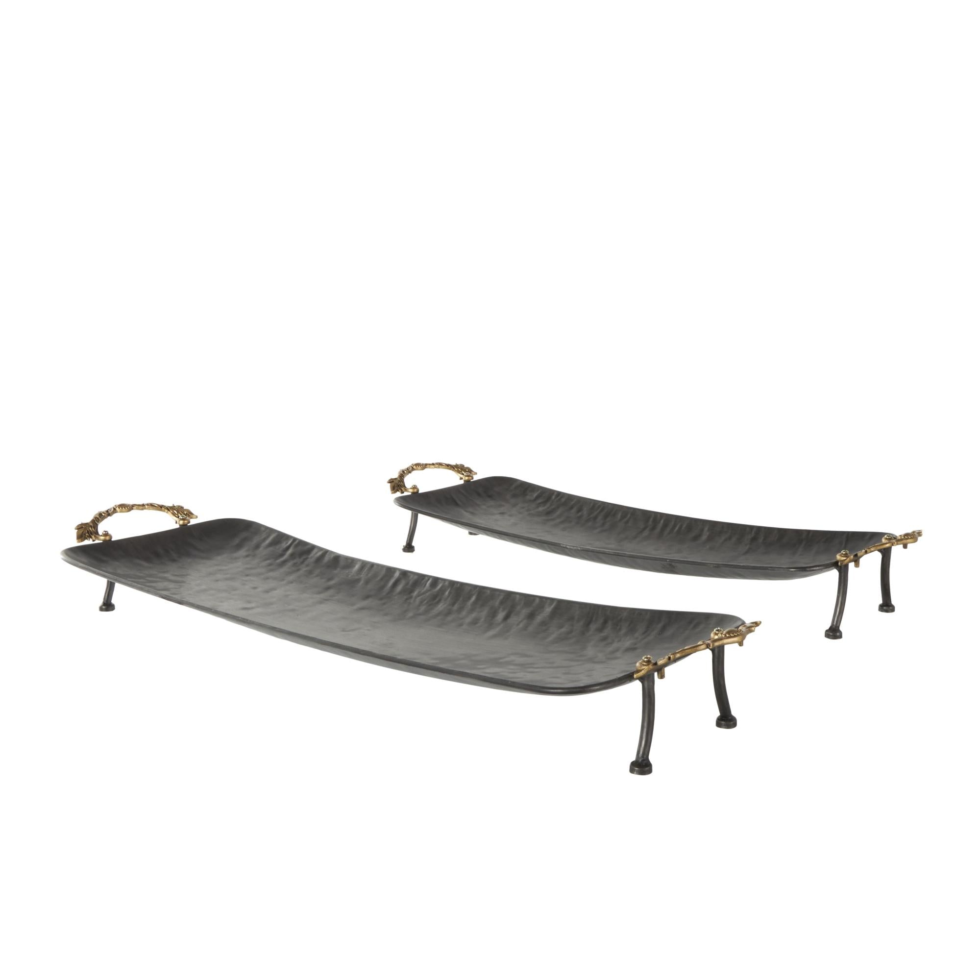 Set of 2 Leaf Black Metal Textured Curved Living Room Decor Tray with Elevated Feet and Gold Scroll Vine Handles