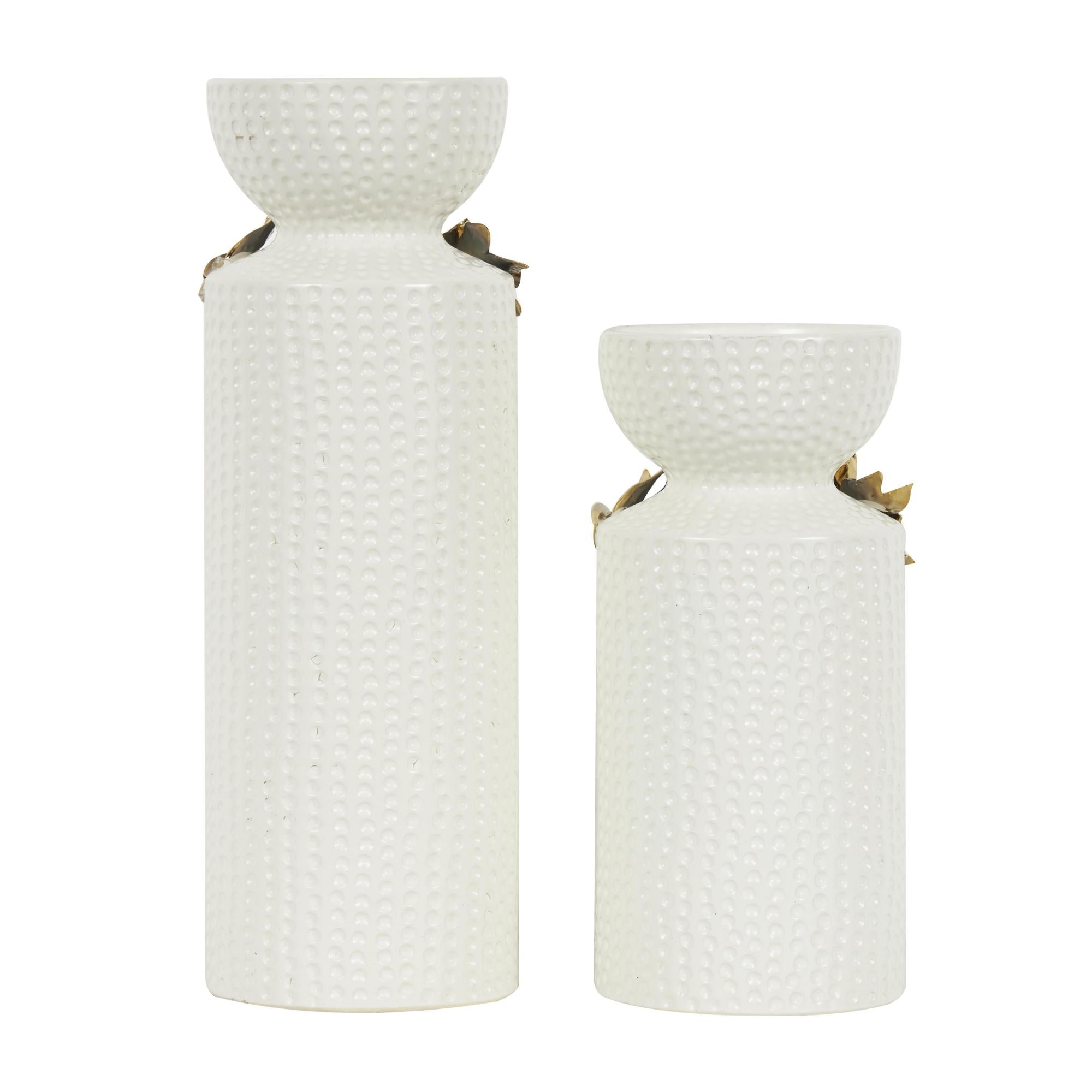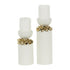 Arrange this set of 2 candle stands together to create a captivating display or position them separately to accentuate different areas of your home. Designed with felt or rubber stoppers at the base that prevent scratching furniture and table tops, as well as sliding around. Can hold 2 pillar candles, not included. This item ships in 1 carton. Ceramic candle holder makes a great gift for any occasion. Suitable for indoor use only. This item ships fully assembled in one piece. This ceramic candle stand comes as a set of 2. Glam style.