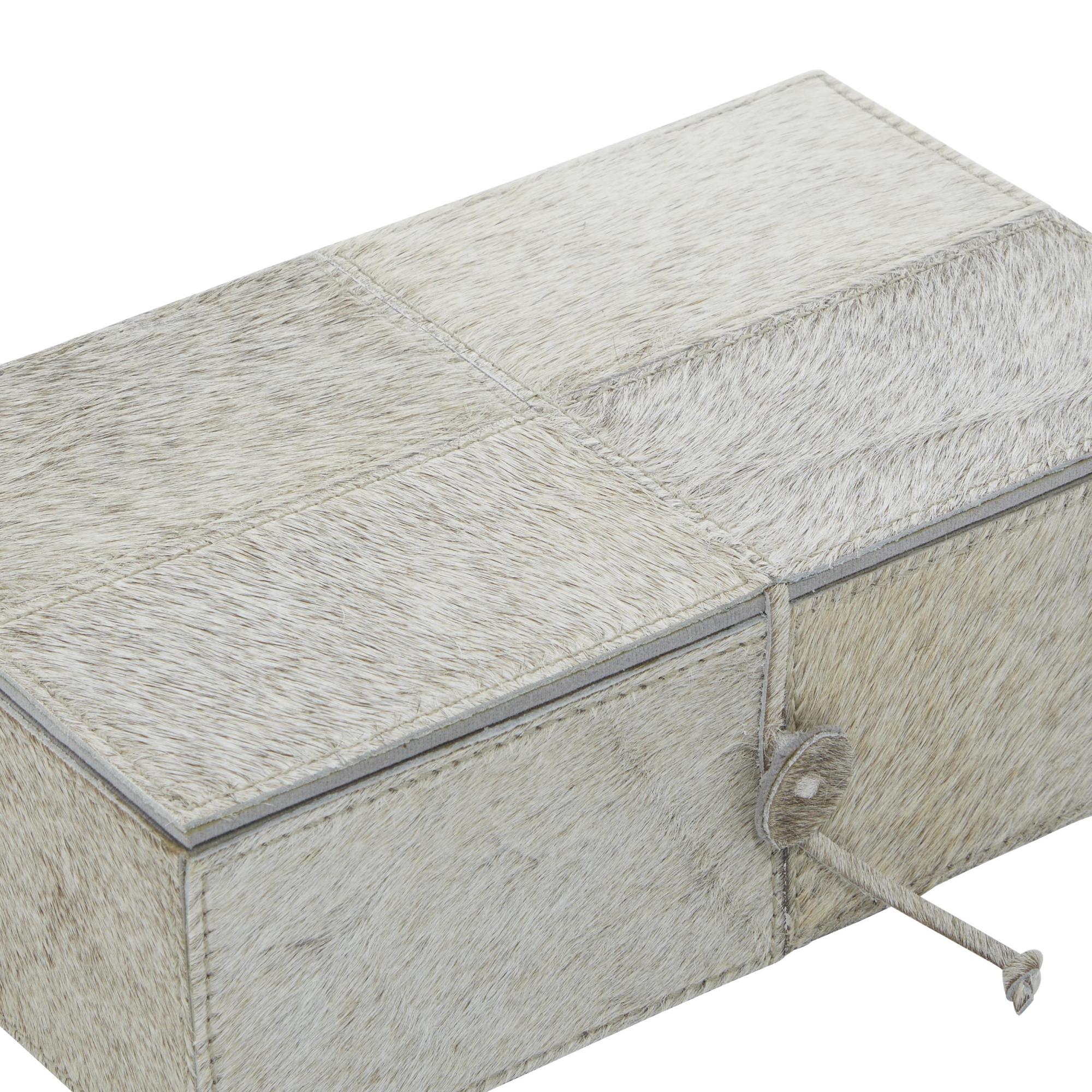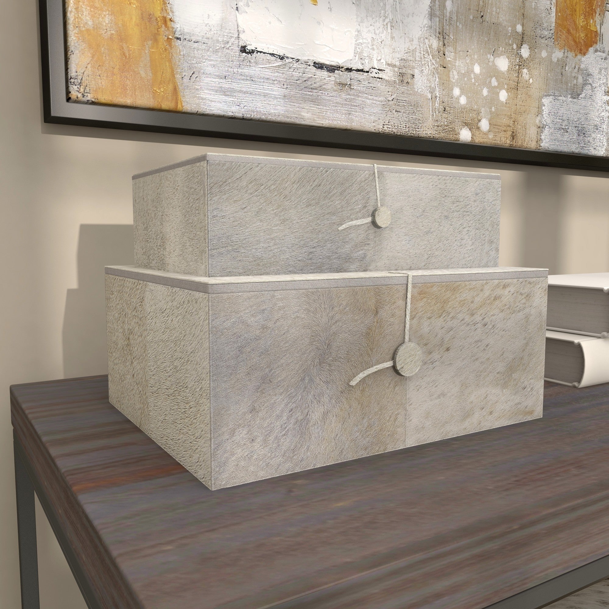This set of 2 decorative keepsake boxes can be used together or separately to store personal belongings in the bedroom or to enhance table displays in the living room. Designed with felt or rubber stoppers at the base that prevent scratching furniture and table tops, as well as sliding around. This item ships in 1 carton. Leather strip wrap closures. Leather box makes a great gift for any occasion. Due to the handmade nature of this item, no two will be alike, there will be slight differences in shape, size, and color. Suitable for indoor use only. This item ships fully assembled in one piece. Leather and hair on hide are natural products, and therefore no two will be alike. There may slight variations in pattern, natural blemishes, colors, and overall aesthetic of the product. Made in India. This leather decorative keepsake box comes as a set of 2. Glam style.