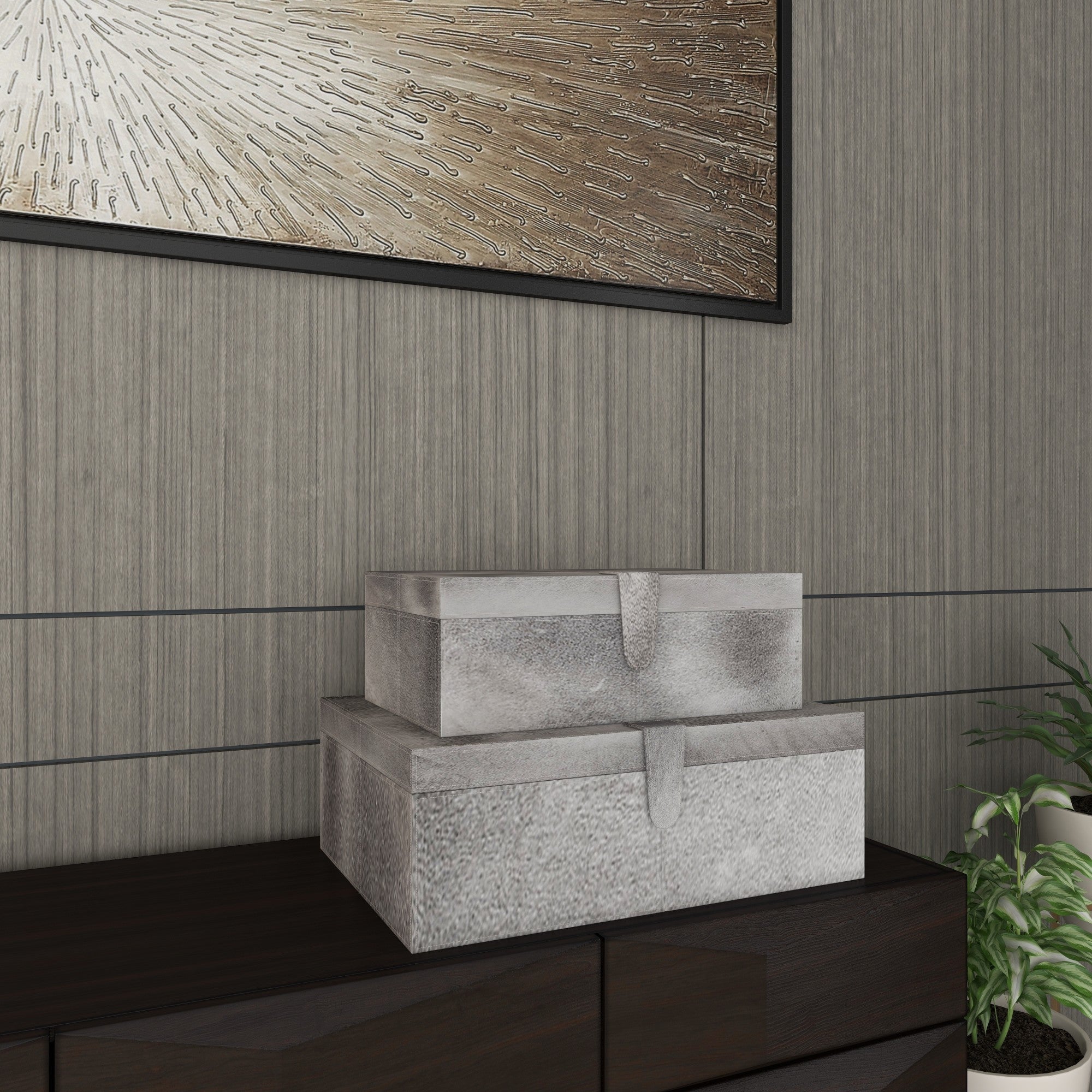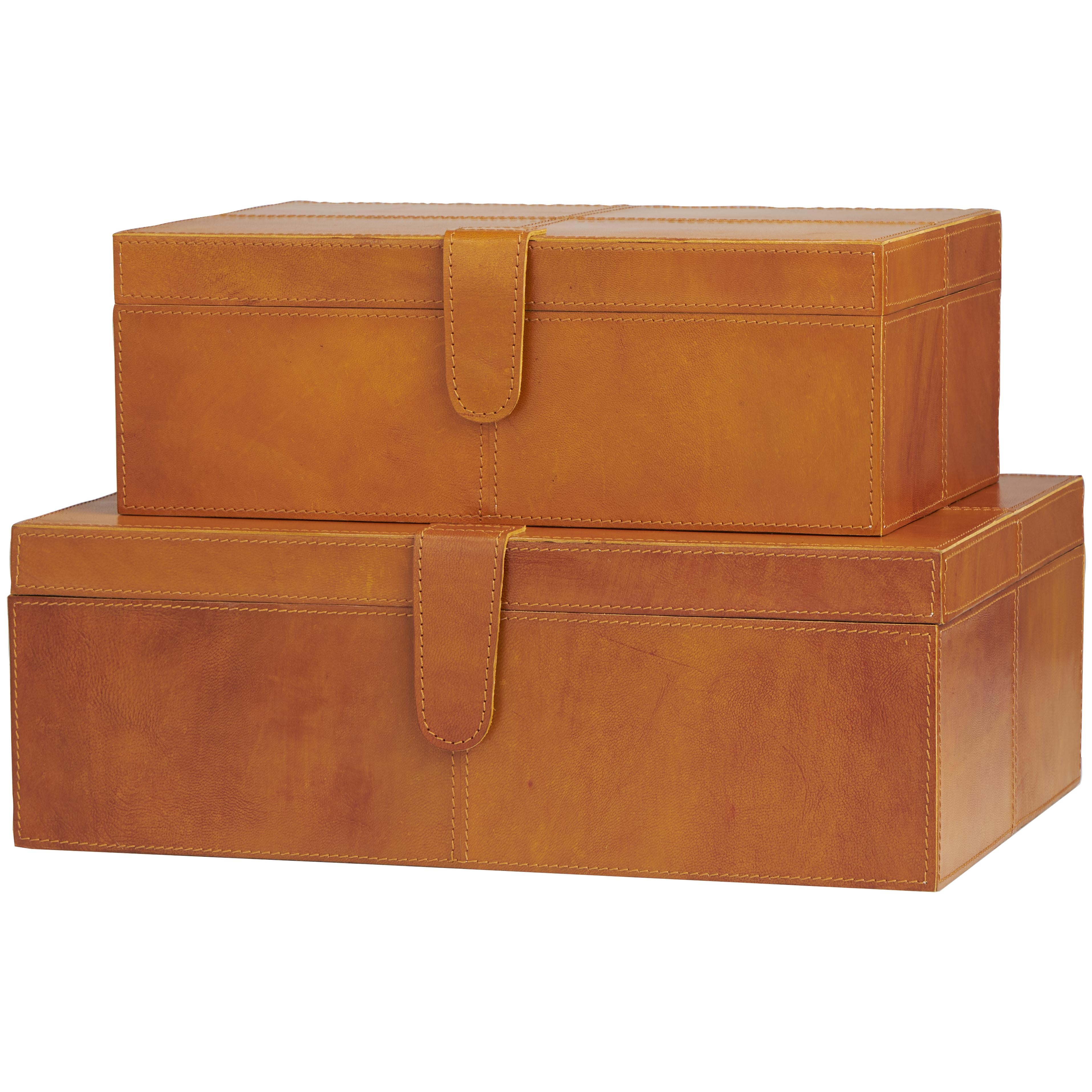 set of 2 decorative keepsake boxes can be used to store personal belongings in the boudoir or to enhance table displays in the living room. Designed with felt or rubber stoppers at the base that prevent scratching furniture and table tops, as well as sliding around. This item ships in 1 carton. Features snap closures to secure your belongings.. Leather box makes a great gift for any occasion. Due to the handmade nature of this item, no two will be alike, there will be slight differences in shape, size, and color. Suitable for indoor use only. This item ships fully assembled in one piece. Leather and hair on hide are natural products, and therefore no two will be alike. There may slight variations in pattern, natural blemishes, colors, and overall aesthetic of the product. Made in India. This leather decorative keepsake box comes as a set of 2. Glam style.