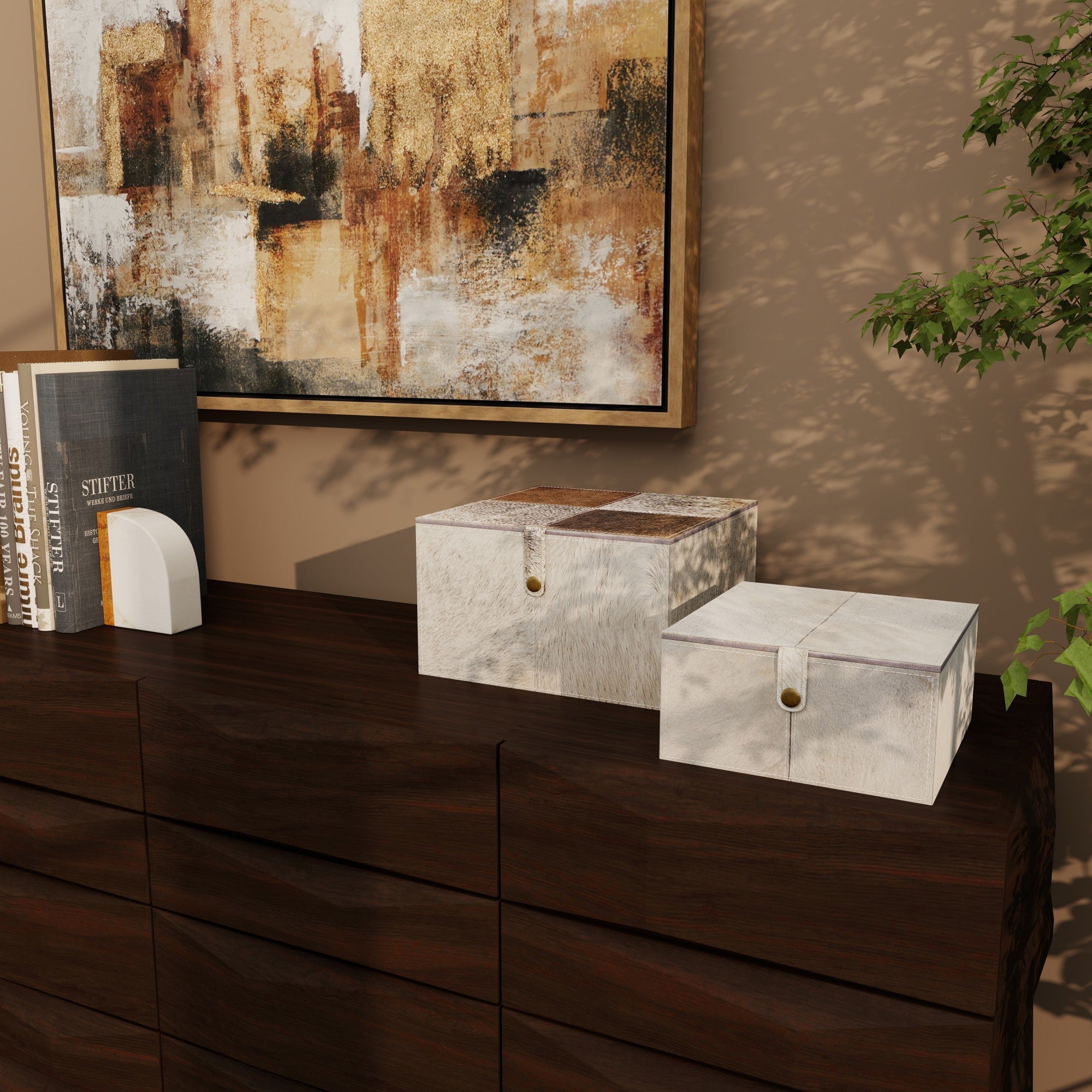 Perfectly suited for storing small objects or jewelry, this set of 2 decorative keepsake boxes can be paired next to a glass vase with fresh greenery on a console table, desk or bookshelf. Designed with felt or rubber stoppers at the base that prevent scratching furniture and table tops, as well as sliding around. This item ships in 1 carton. Leather box makes a great gift for any occasion. Due to the handmade nature of this item, no two will be alike, there will be slight differences in shape, size, and color. Suitable for indoor use only. This item ships fully assembled in one piece. Leather and hair on hide are natural products, and therefore no two will be alike. There may slight variations in pattern, natural blemishes, colors, and overall aesthetic of the product. Made in India. This leather decorative keepsake box comes as a set of 2. Modern style.