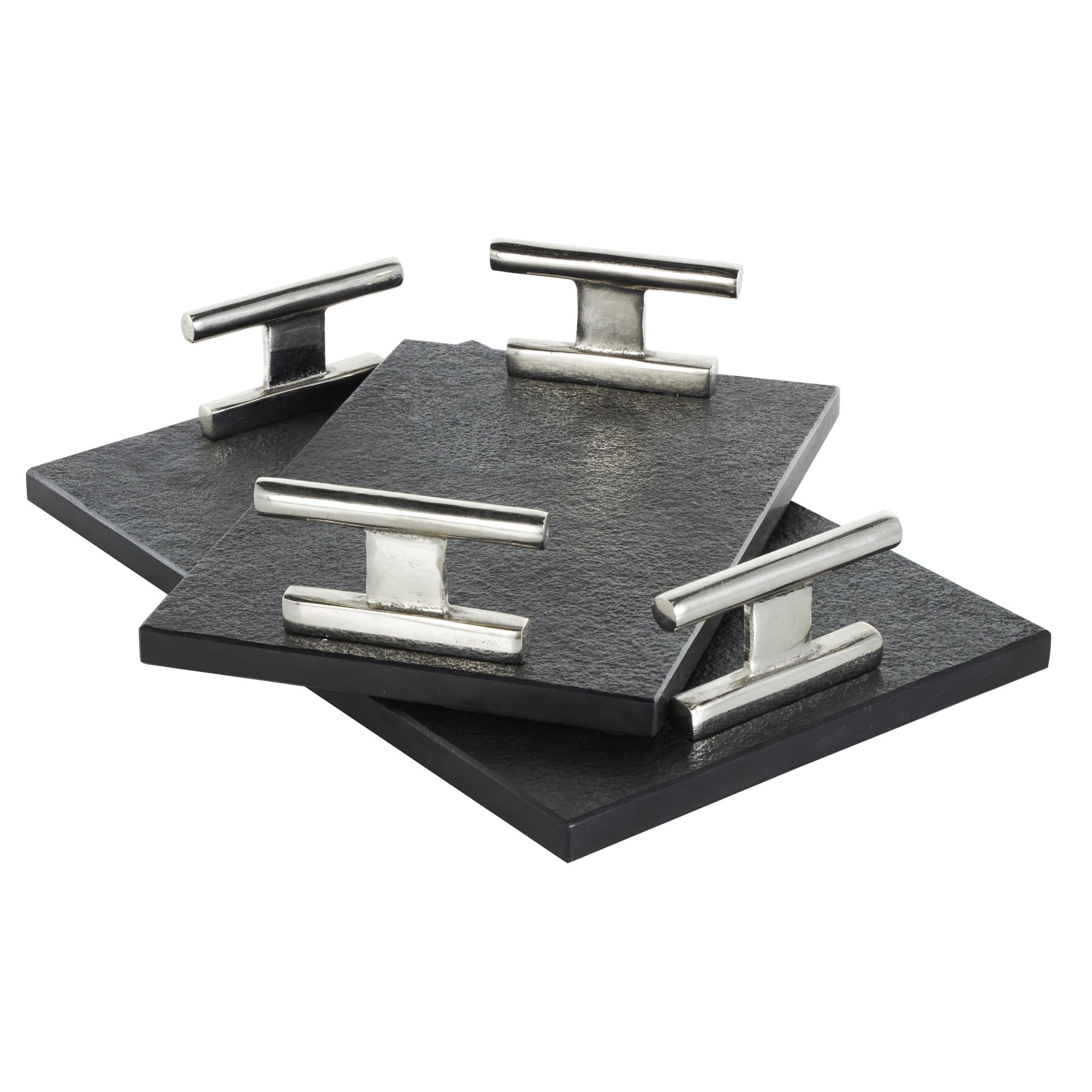 •The marble set of 2 trays features a textured surface that adds depth to the overall design and rod handles that provide a striking contrast
