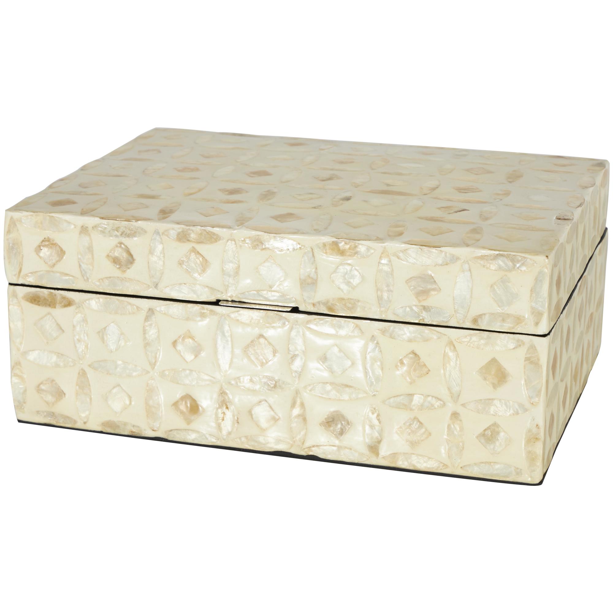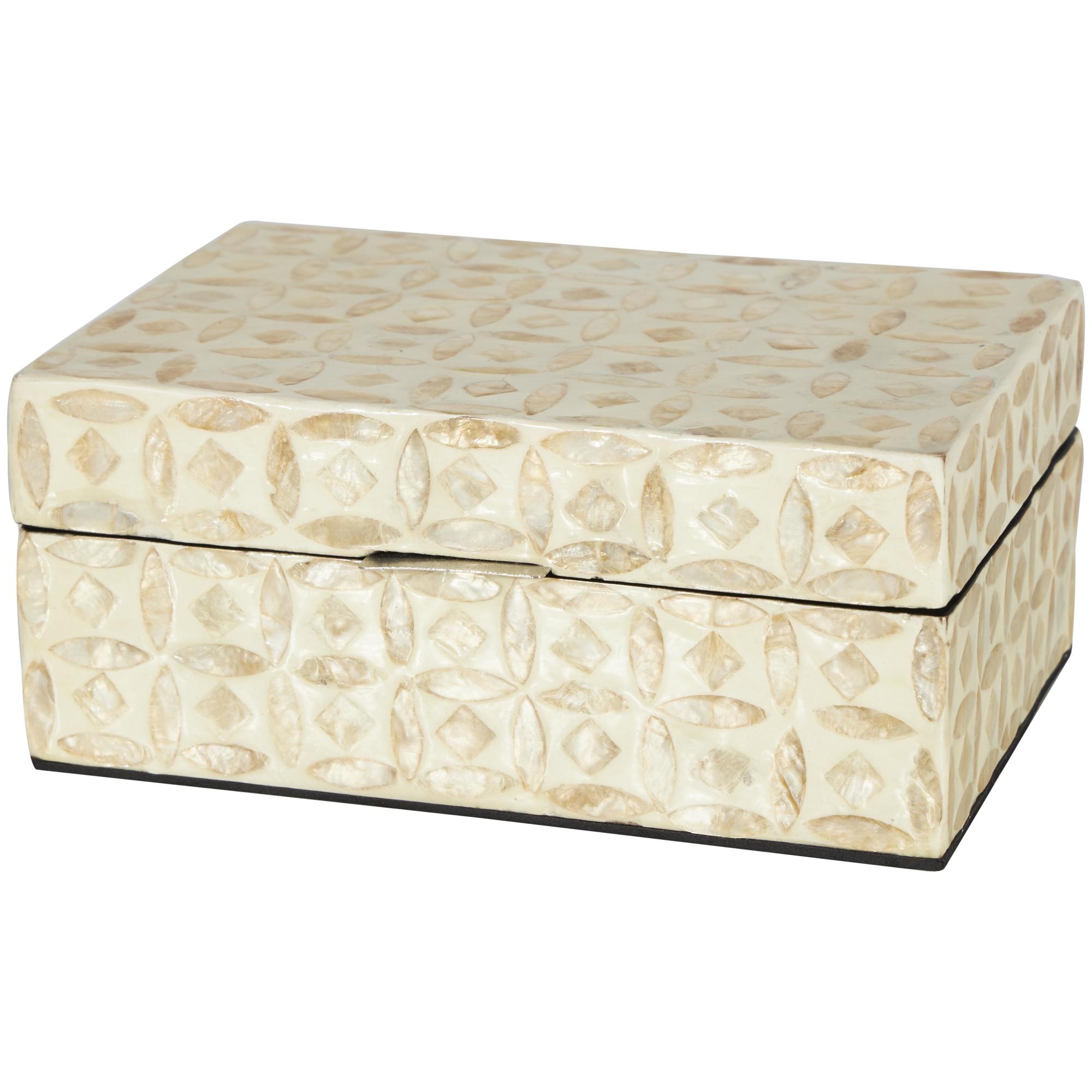 Perfect way to add depth and texture to your surface space with this compact and discreet box. A practical yet stylish upgrade that instantly elevate the look of your room. Ideal for use as a jewelry box or table centerpiece in living rooms, this set of 2 decorative keepsake boxes infuses any space with a laidback vibe. Designed with felt or rubber stoppers at the base that prevent scratching furniture and table tops, as well as sliding around. This item ships in 1 carton. Mother of pearl box makes a great gift for any occasion. Suitable for indoor use only. This item ships fully assembled in one piece. Made in Vietnam. This mother of pearl decorative keepsake box comes as a set of 2. Coastal style.