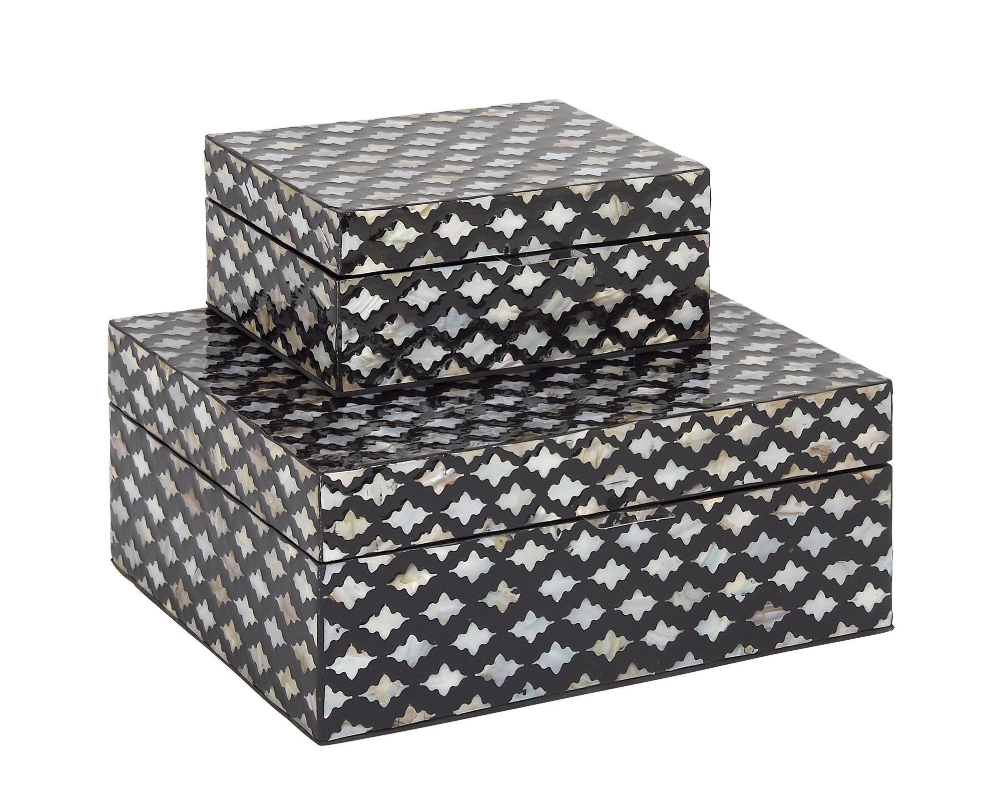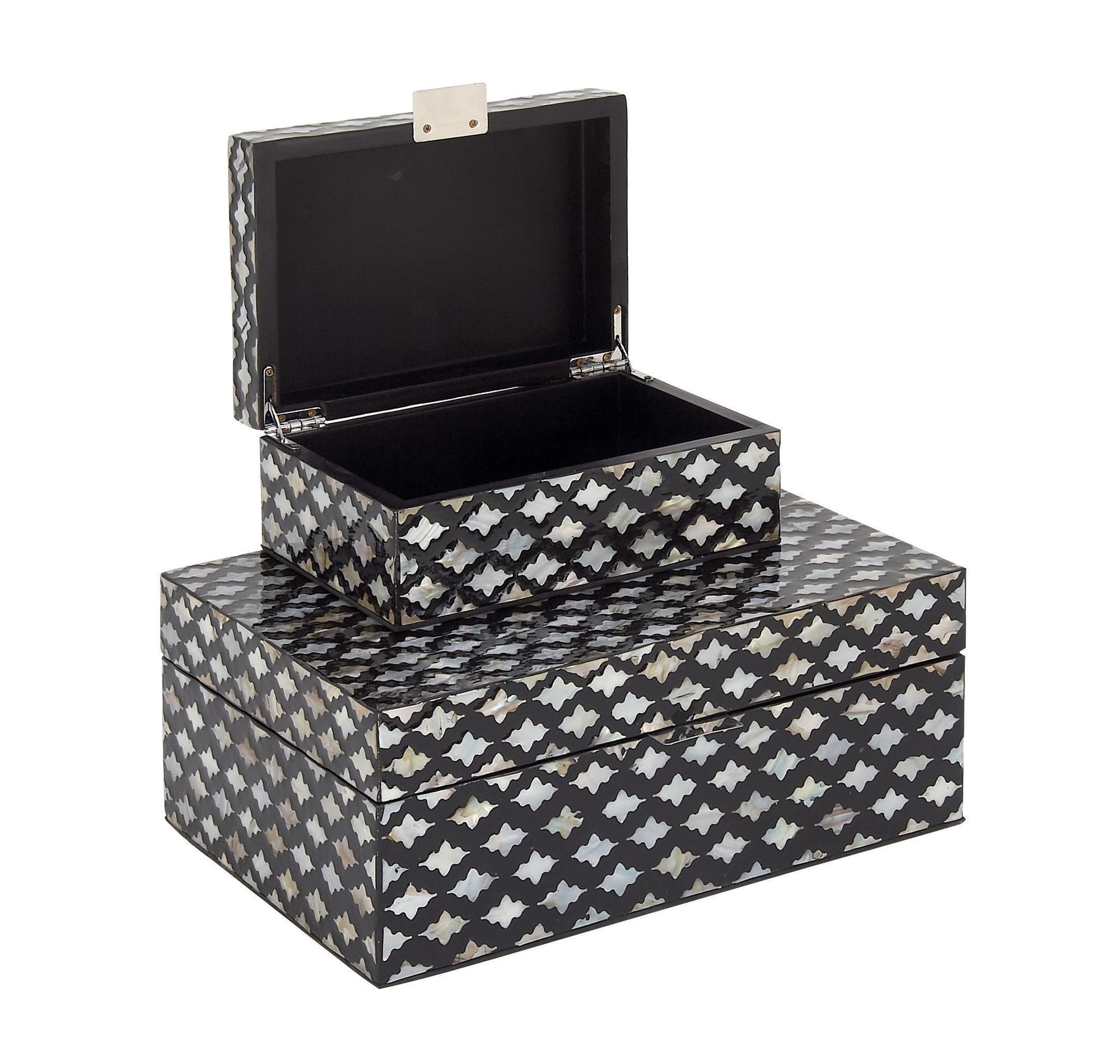 •Mother of pearl set of 2 boxes features a beautiful mussel shell edge pattern, enhancing their overall elegance