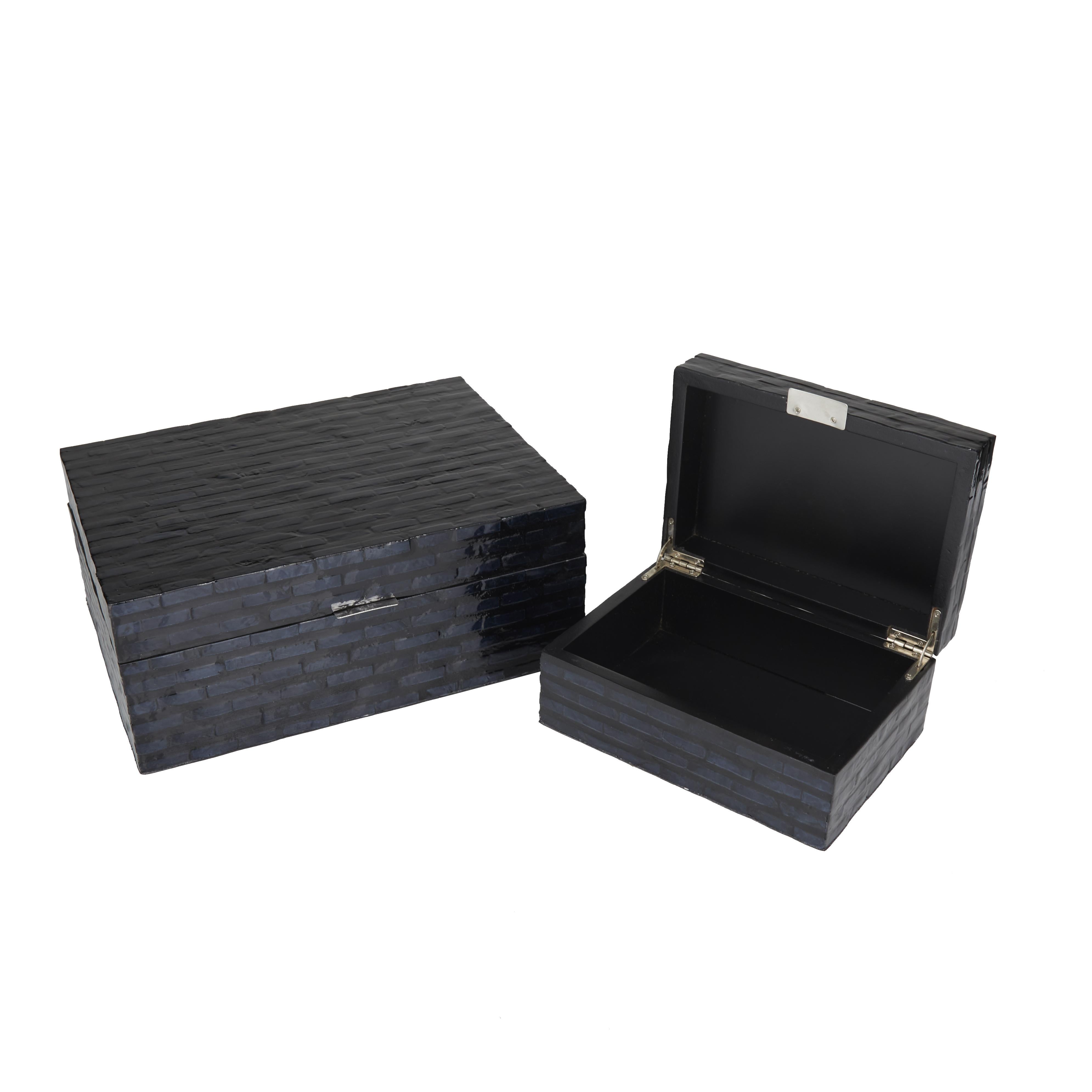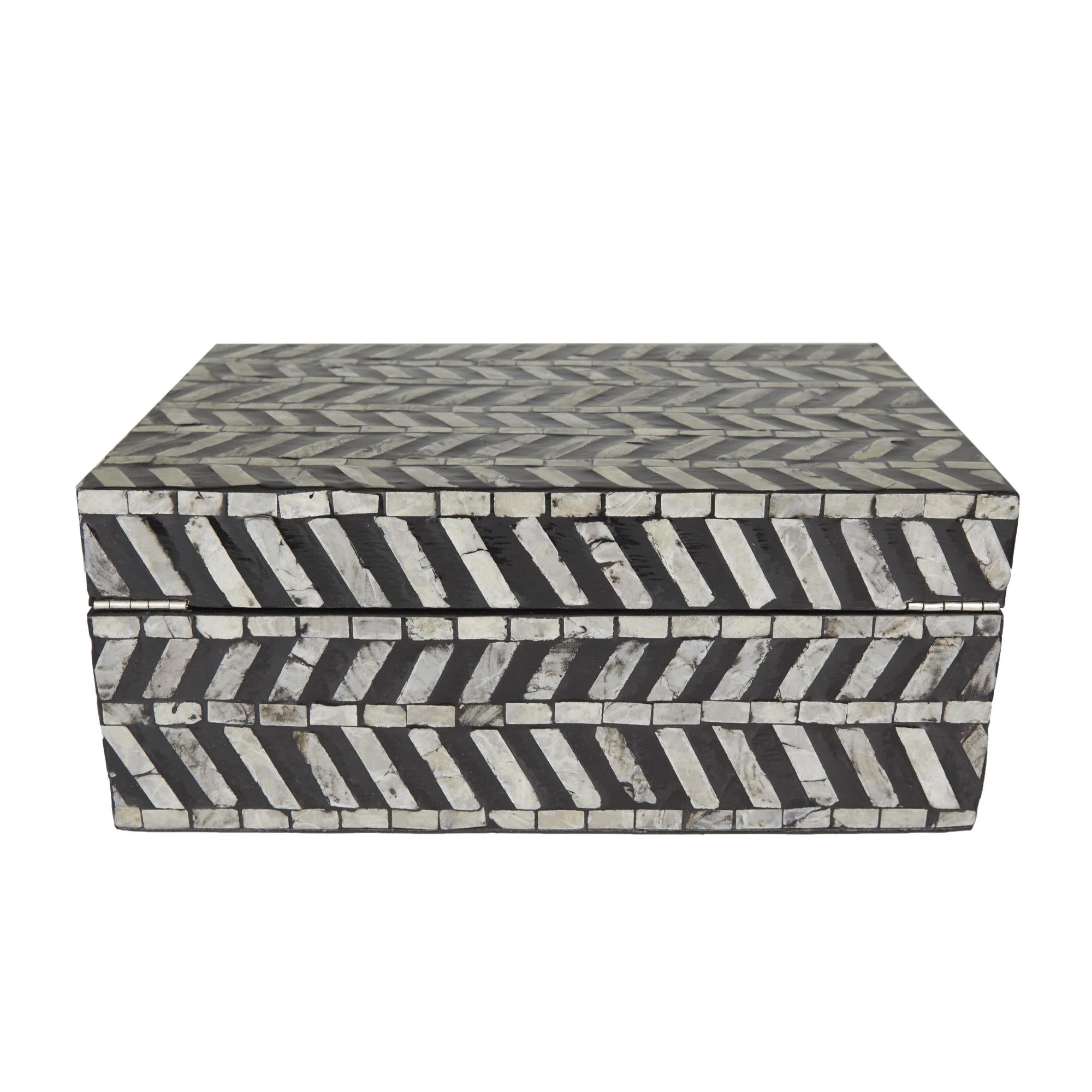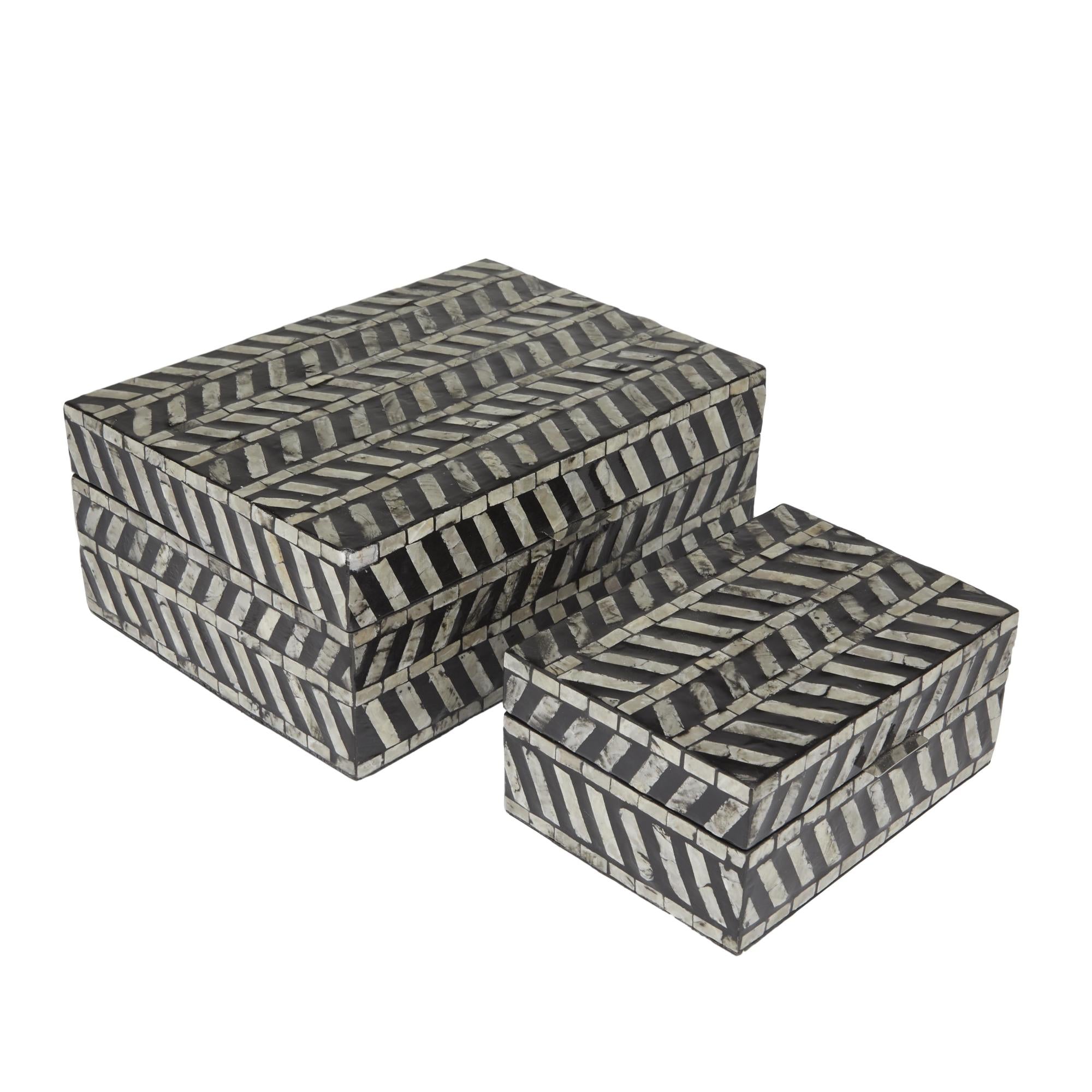 •Mother of pearl set of 2 boxes features a chevron pattern, deep storage capacity, and hinged lids for dust protection