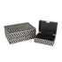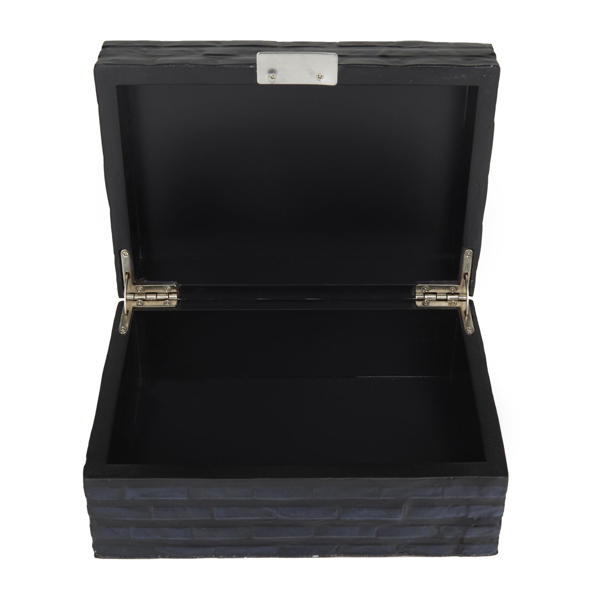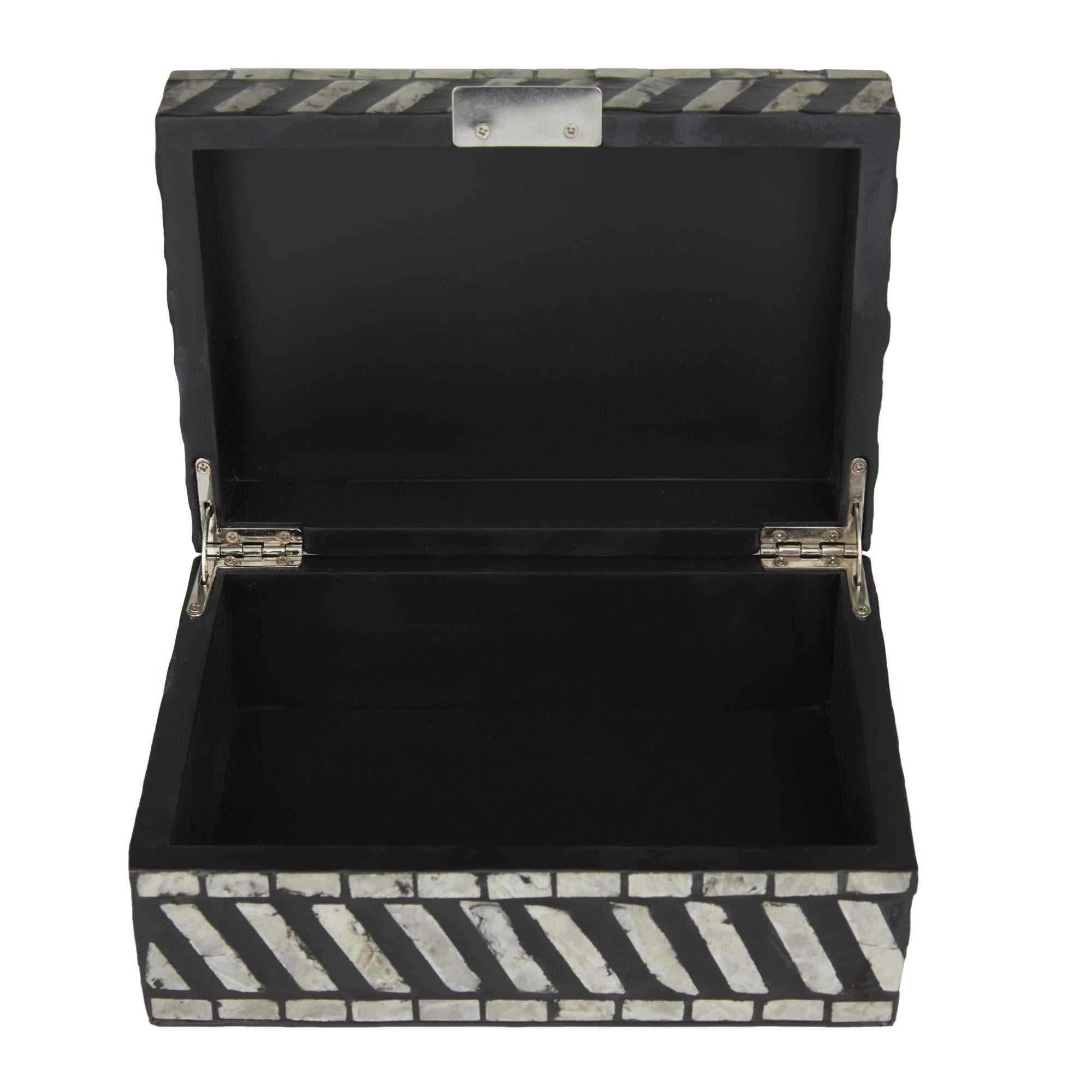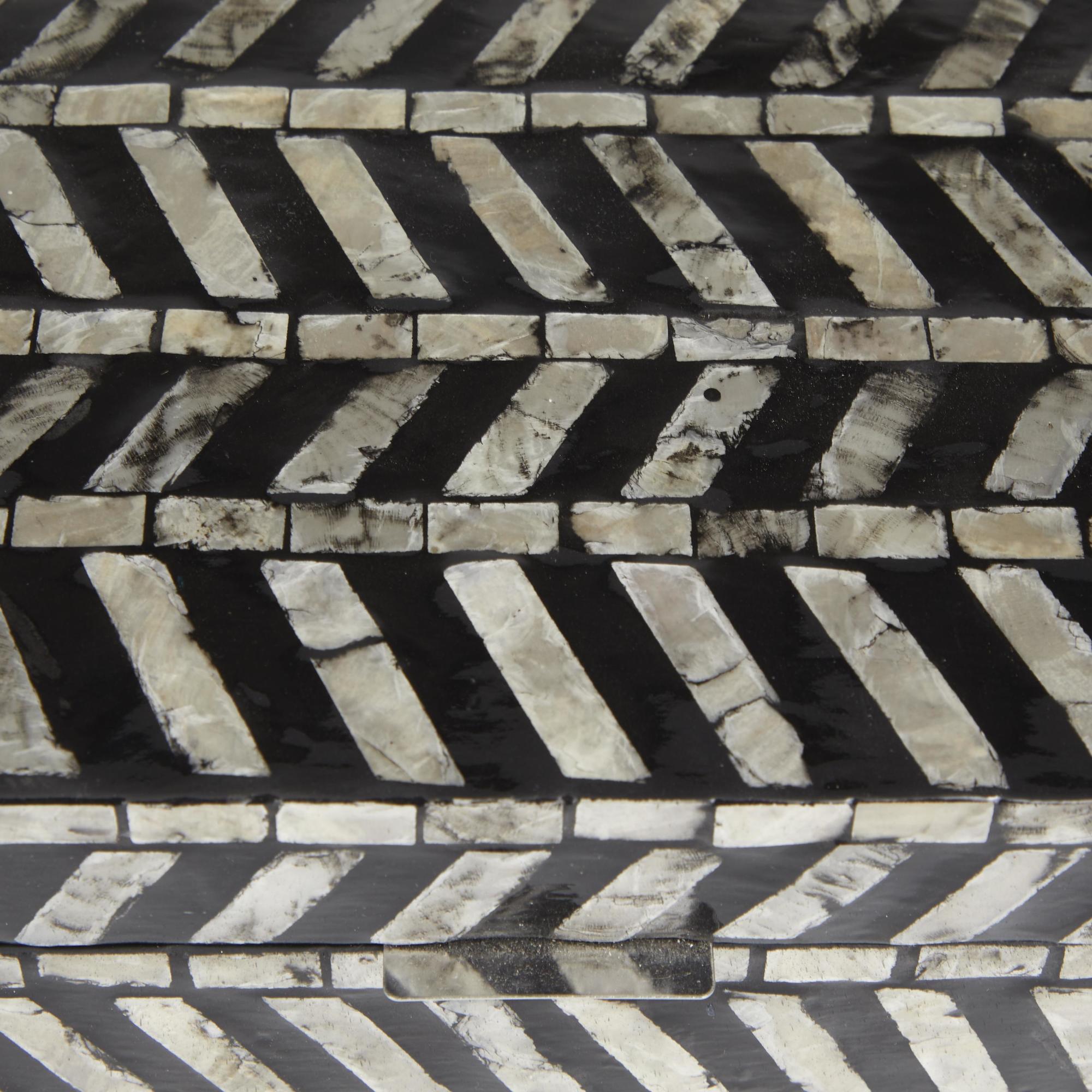•Mother of pearl set of 2 boxes features a chevron pattern, deep storage capacity, and hinged lids for dust protection