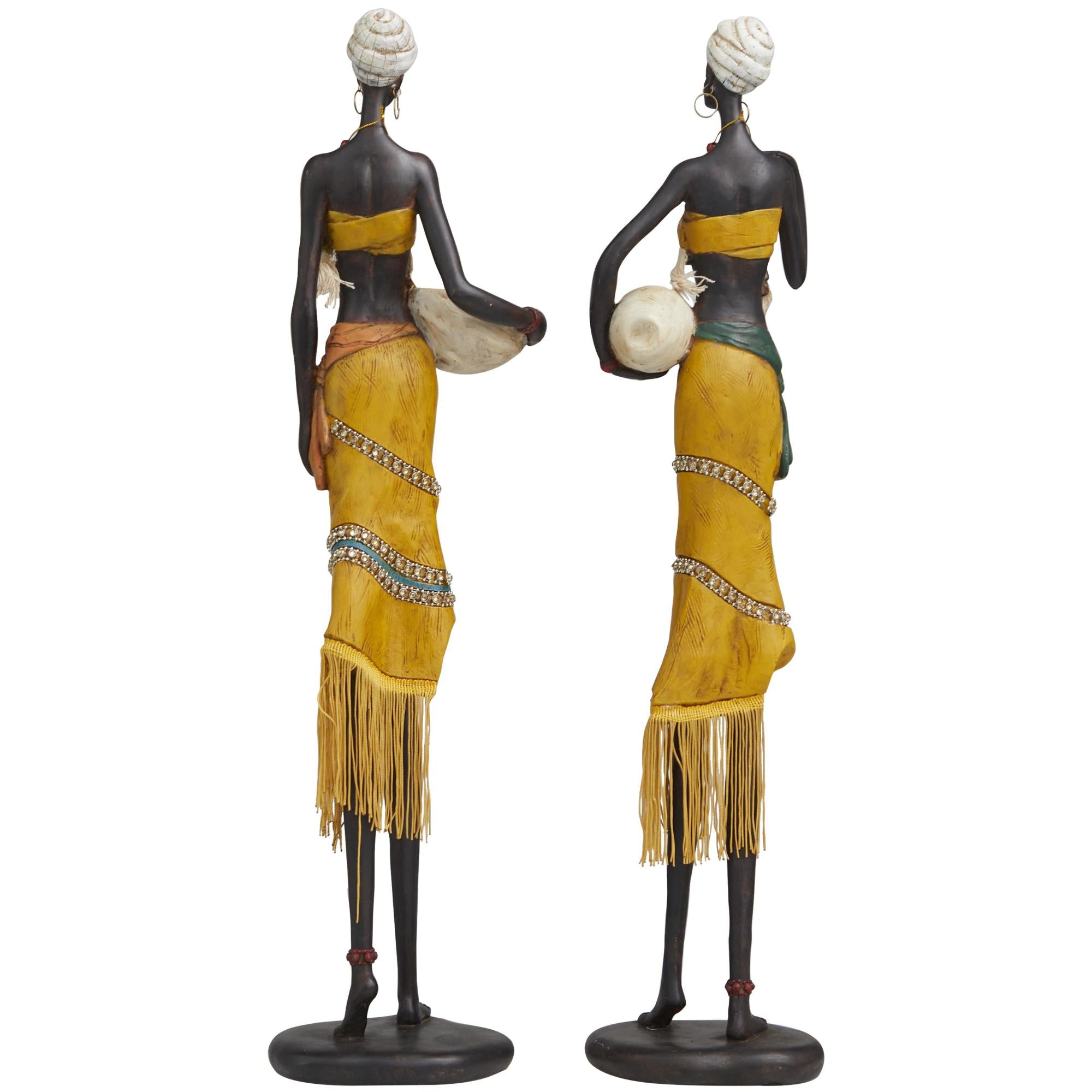 Set of 2 Woman Yellow Polyresin Handmade African Decorative Sculpture with Water Jugs and Jeweled Details