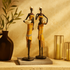 •Matte home decor figurines highlight women-shaped sculptures with dresses flaunting tribal patterns and fringe, each holding a jar on their sides