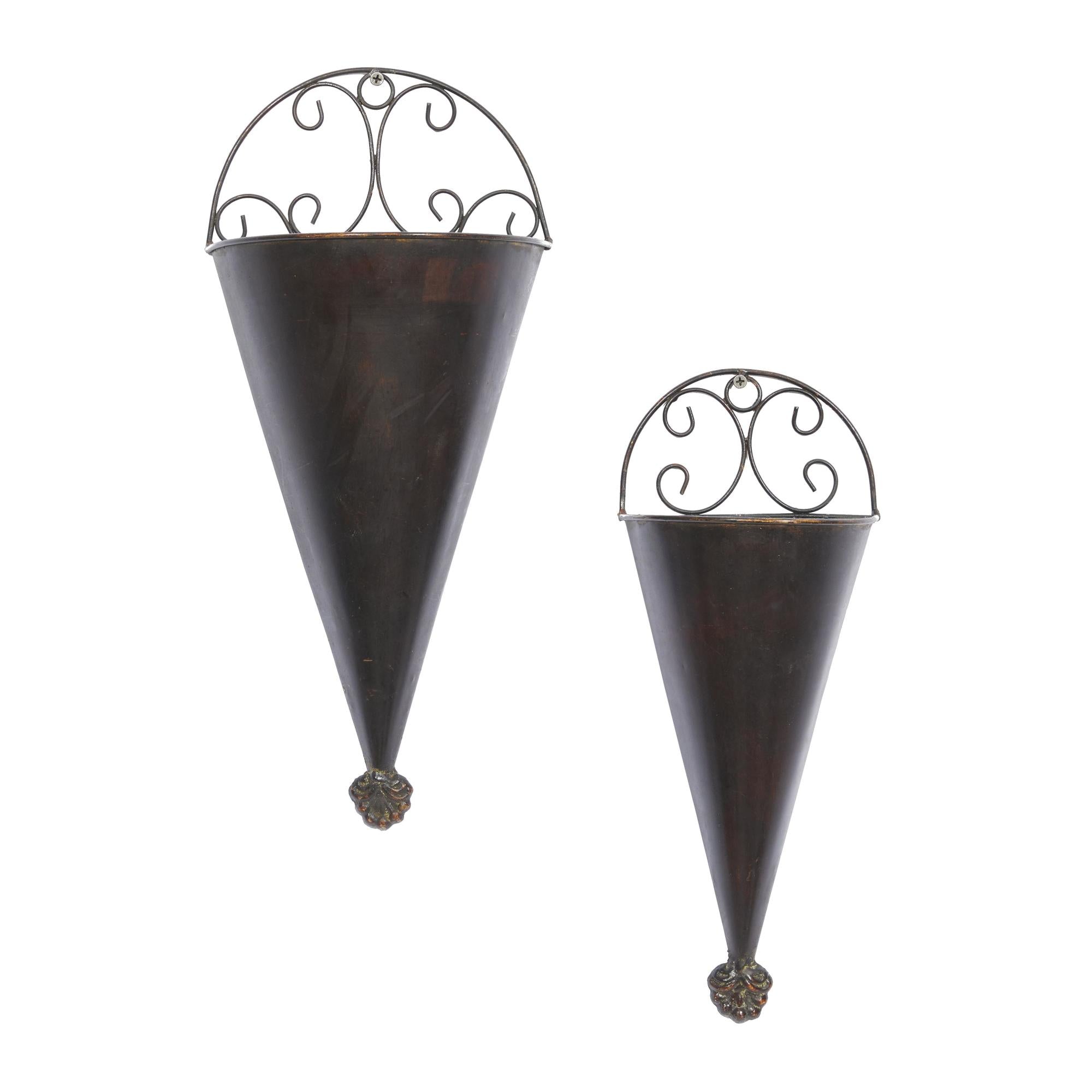 Set of 2 Scroll Black Metal Cone Indoor Outdoor Wall Planter
