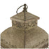 •The distressed lantern candle holder decor features a rectangular body with scroll patterns and a layered triangular and arched top with round handles
