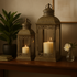 •This indoor outdoor candle lantern set is intricately crafted from sturdy metal and recycled glass material to ensure durability and elegance