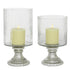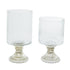 •The glass set of 2 hurricane lamps features a faux mercury finish with two wide lanterns of varying heights, each encased in protective glass