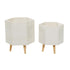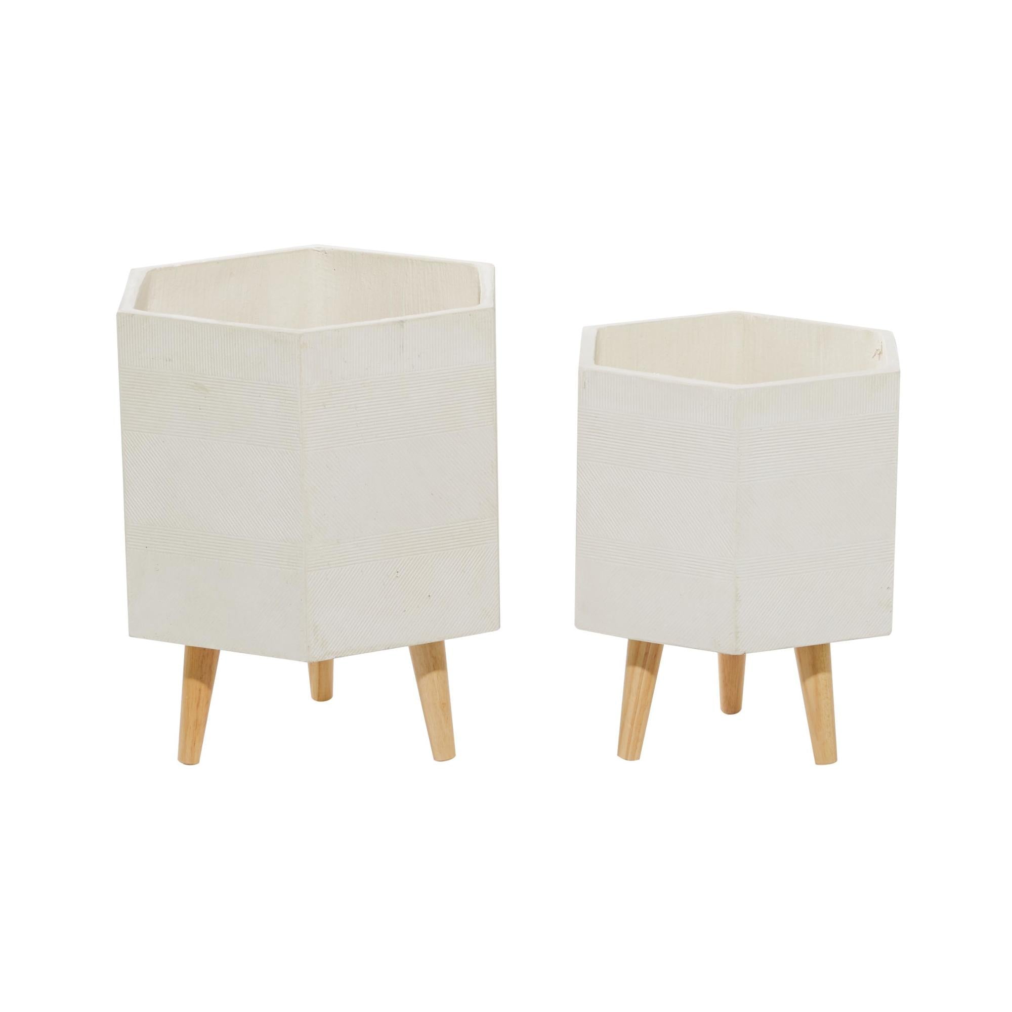 •Contemporary set of 2 planters features a unique hexagonal shape and is supported by sturdy wooden legs for added stability