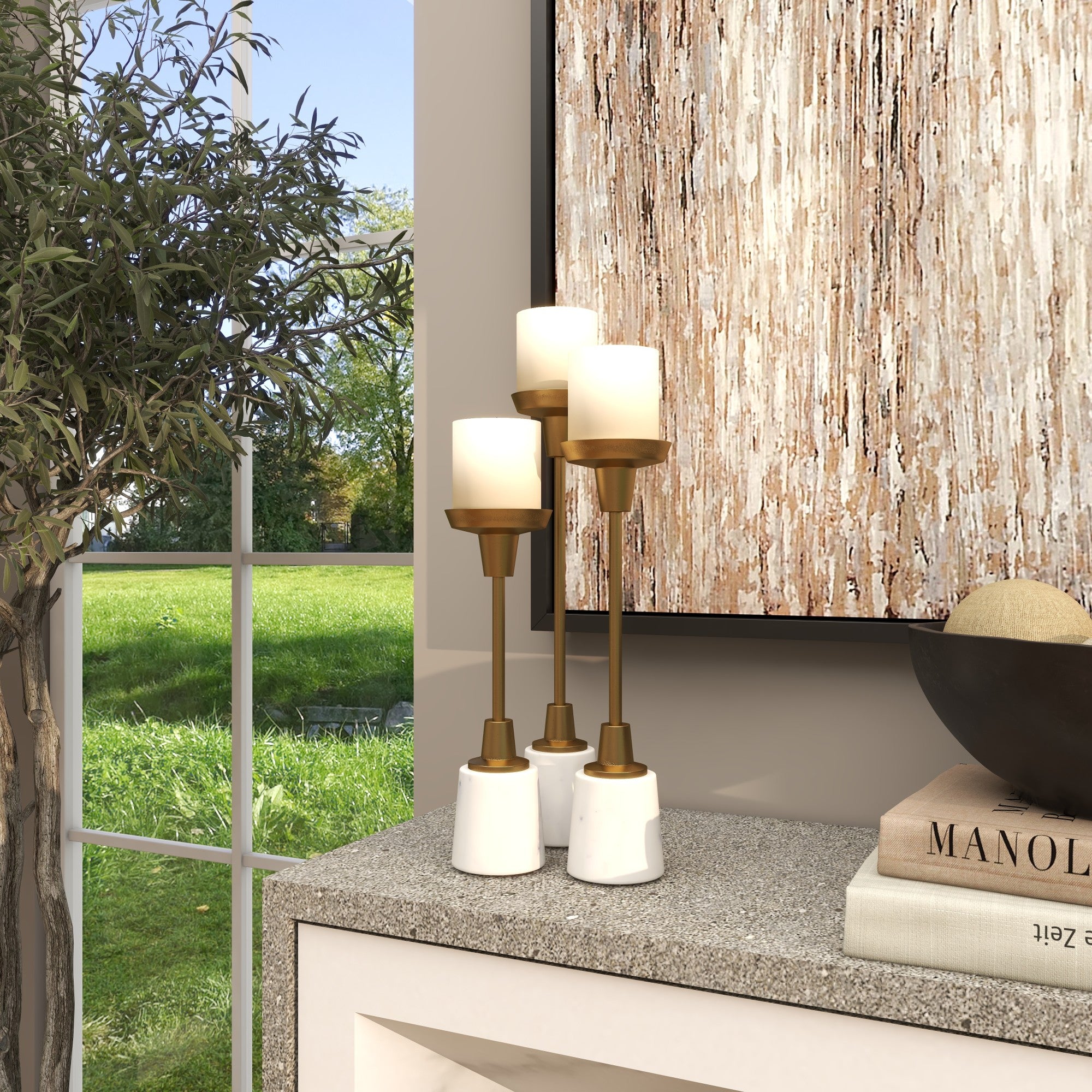 •This modern set of 3 candle holders for home decor is welded with aluminum and attached to marble bases for durability and aesthetic appeal