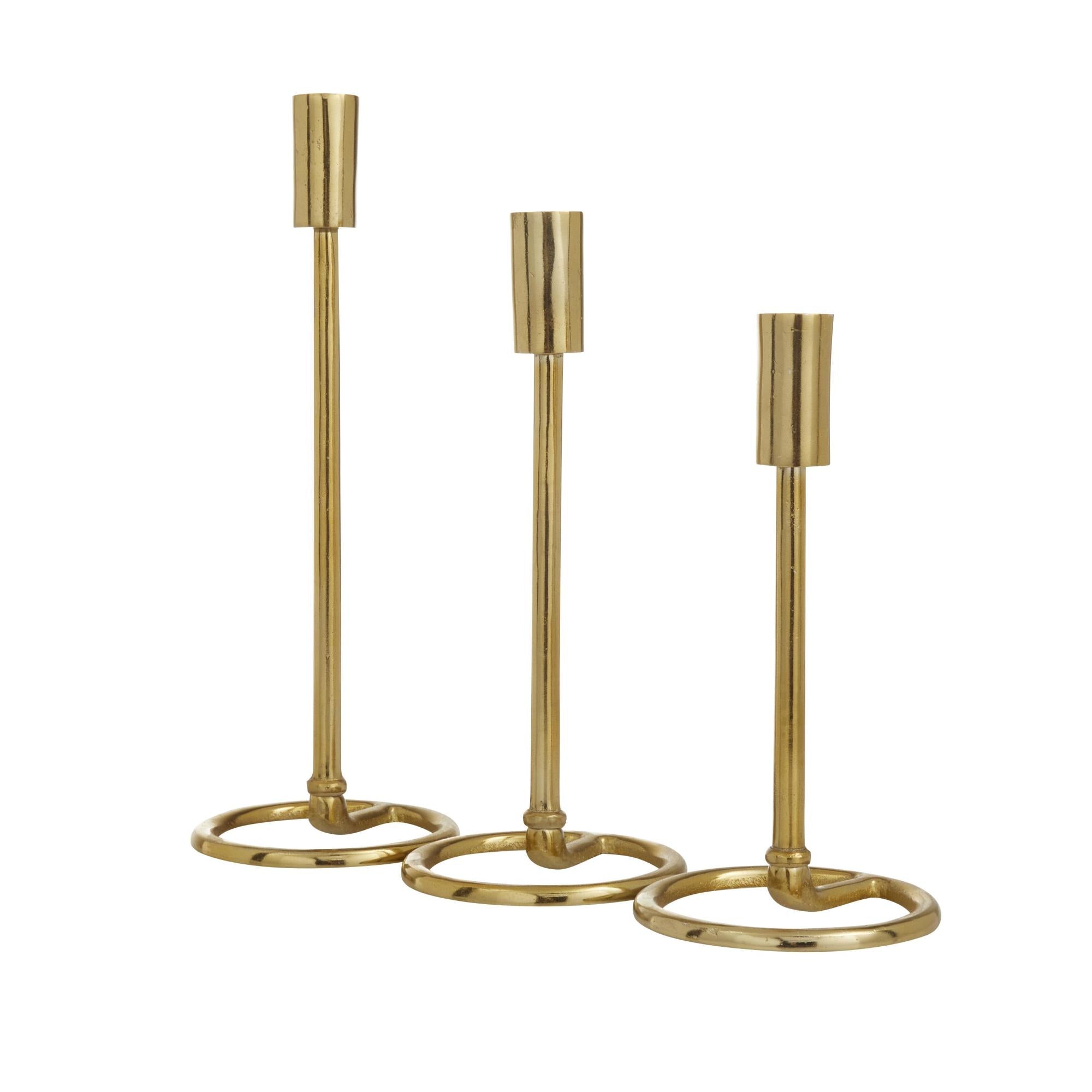 Give your space a radiant illumination with these beautifully crafted candle holders. Made with a sturdy base, it is perfect for creating an elegant atmosphere at your table top or mantel. Display this set of 3 candle stands as a standalone piece or as an accent centerpiece to elevate your living room or bedroom. Can hold 3 taper candles, not included. This item ships in 1 carton. Aluminum candle holder makes a great gift for any occasion. Suitable for indoor use only. This item ships fully assembled in one piece. Made in India. This aluminum candle stand comes as a set of 3. Contemporary style.