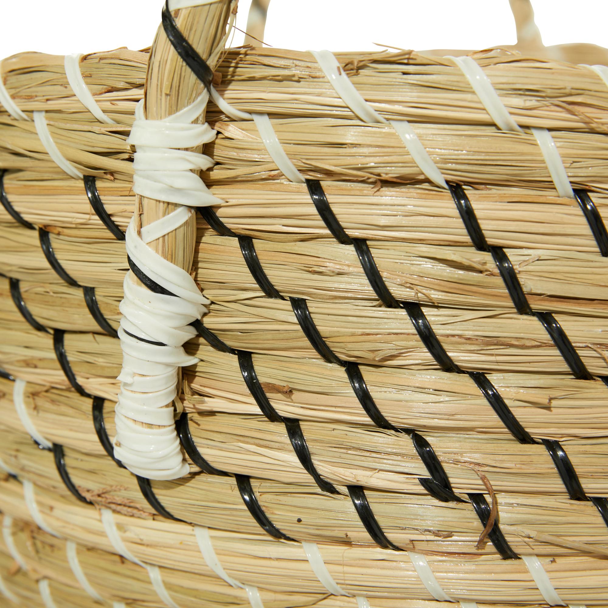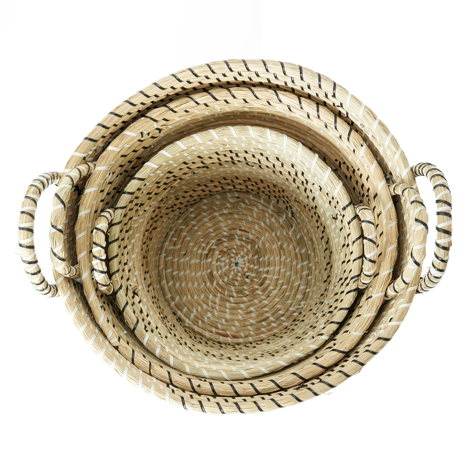 Set of 3 Beige Seagrass Handmade Woven Decorative and Functional Storage Basket with Black and White Zig Zag Pattern