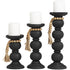 • decorative candle holder set is crafted of natural pine wood and jute rope accents, adding a rustic yet sophisticated touch to any space