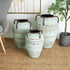 •These distressed vases for decoration feature an amphora shape, four iron-forged mouth handles, and a line-sculpted body exterior