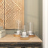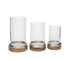 •The varnished hurricane glass candle holders feature cylindrical glass shades and round bases with natural wood grain patterns, exuding organic appeal
