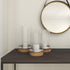 •The room hurricane lamp set is crafted from aluminum, mango wood, and glass materials, combining durability with natural elegance