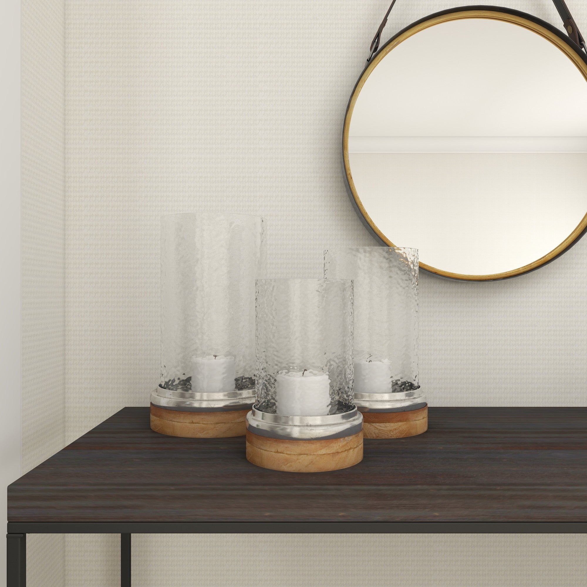 •The wood set of 3 hurricane lamps features hammered glass covers atop elegant metal plates and mango wood bases