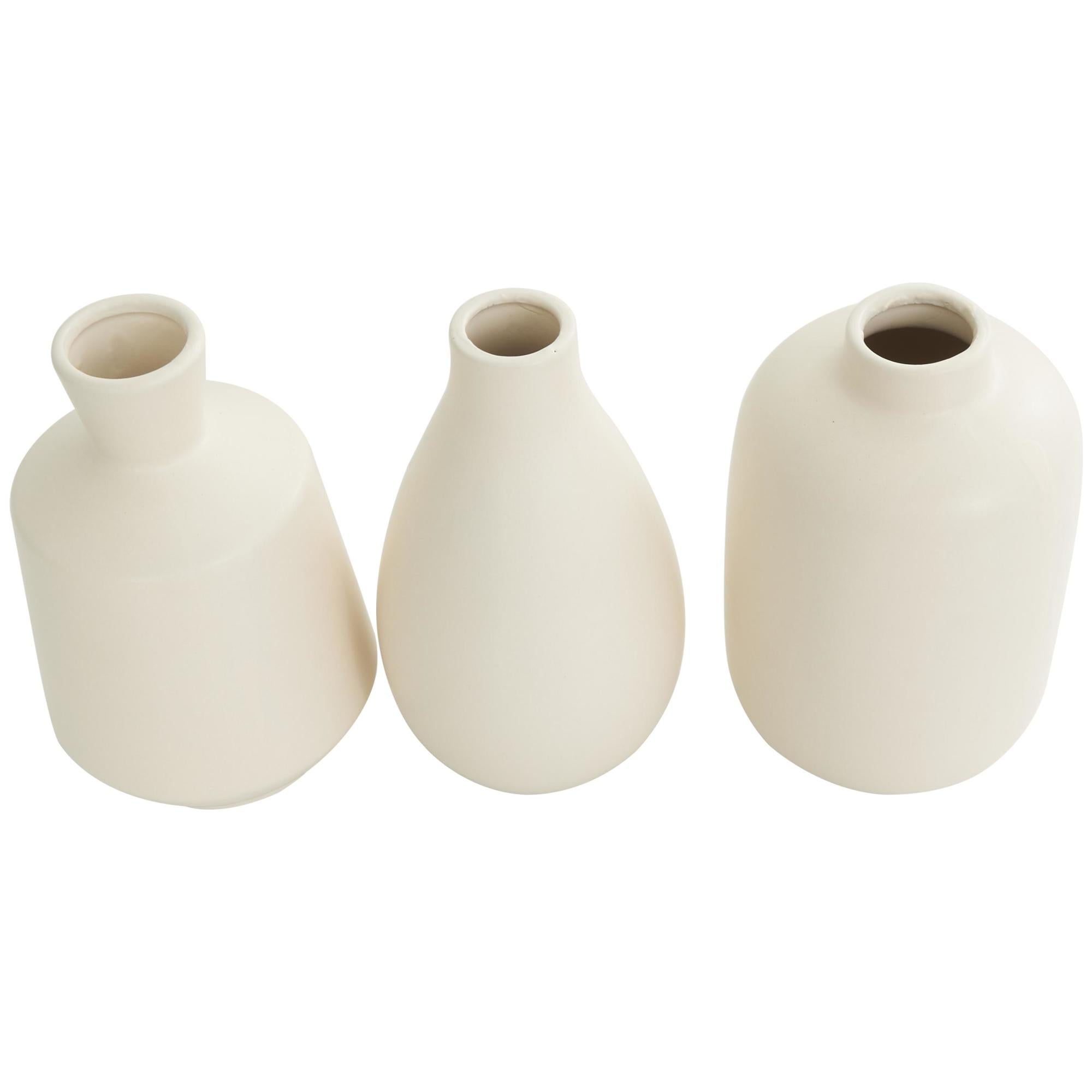 The set of 3 centerpiece vases is perfect for enhancing any living space, such as the dining room or living area. Designed with felt or rubber stoppers at the base that prevent scratching furniture and table tops, as well as sliding around. This item ships in 1 carton. Ceramic vase makes a great gift for any occasion. Suitable for indoor use only. This item ships fully assembled in one piece. This ceramic vase comes as a set of 3. Contemporary style. Vases have 1.20 in, 1.20 in, and 1 in mouth openings.