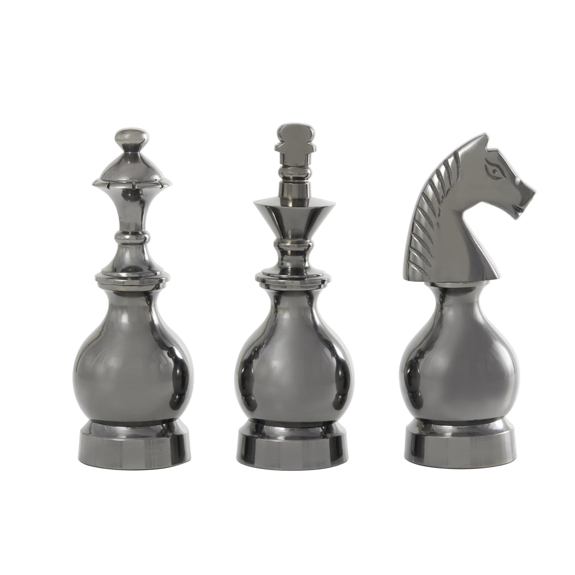 Make a bold statement with this chess set of 3 home decor statues and place them on a console, bookshelf, or mantle surrounded by stacked books and fresh greenery. Designed with felt or rubber stoppers at the base that prevent scratching furniture and table tops, as well as sliding around. This item ships in 1 carton. Please note that this item is for decorative use only. Aluminum sculpture makes a great gift for any occasion. Suitable for indoor use only. This item ships fully assembled in one piece. Made in India. This aluminum statue comes as a set of 3. Traditional style.