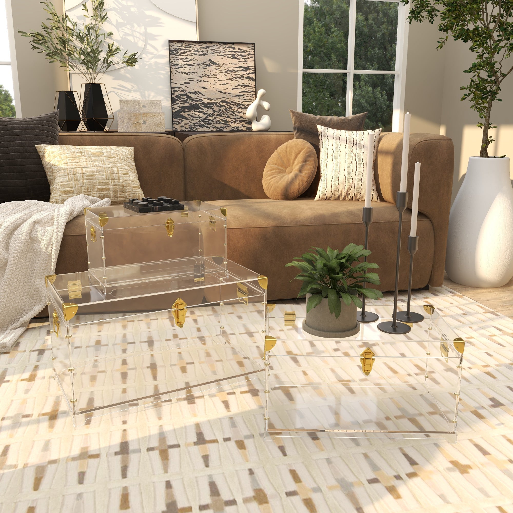 •This acrylic set of 3 trunks features hardware that infuses any space with a touch of sophistication
