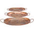 •This rustic metal set of 3 trays features an elongated oval design with metal handles and a hammered copper exterior, creating a warm elegance to any space
