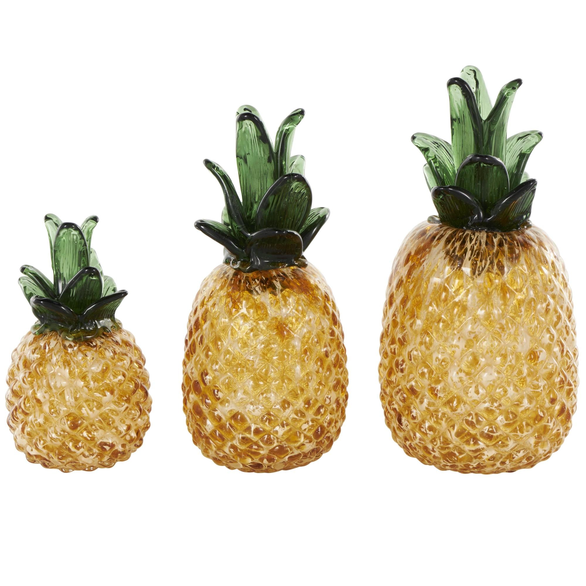 •Glass set of 3 sculptures features a faceted surface that adds visual interest, with the pineapple shape lending a tropical vibe