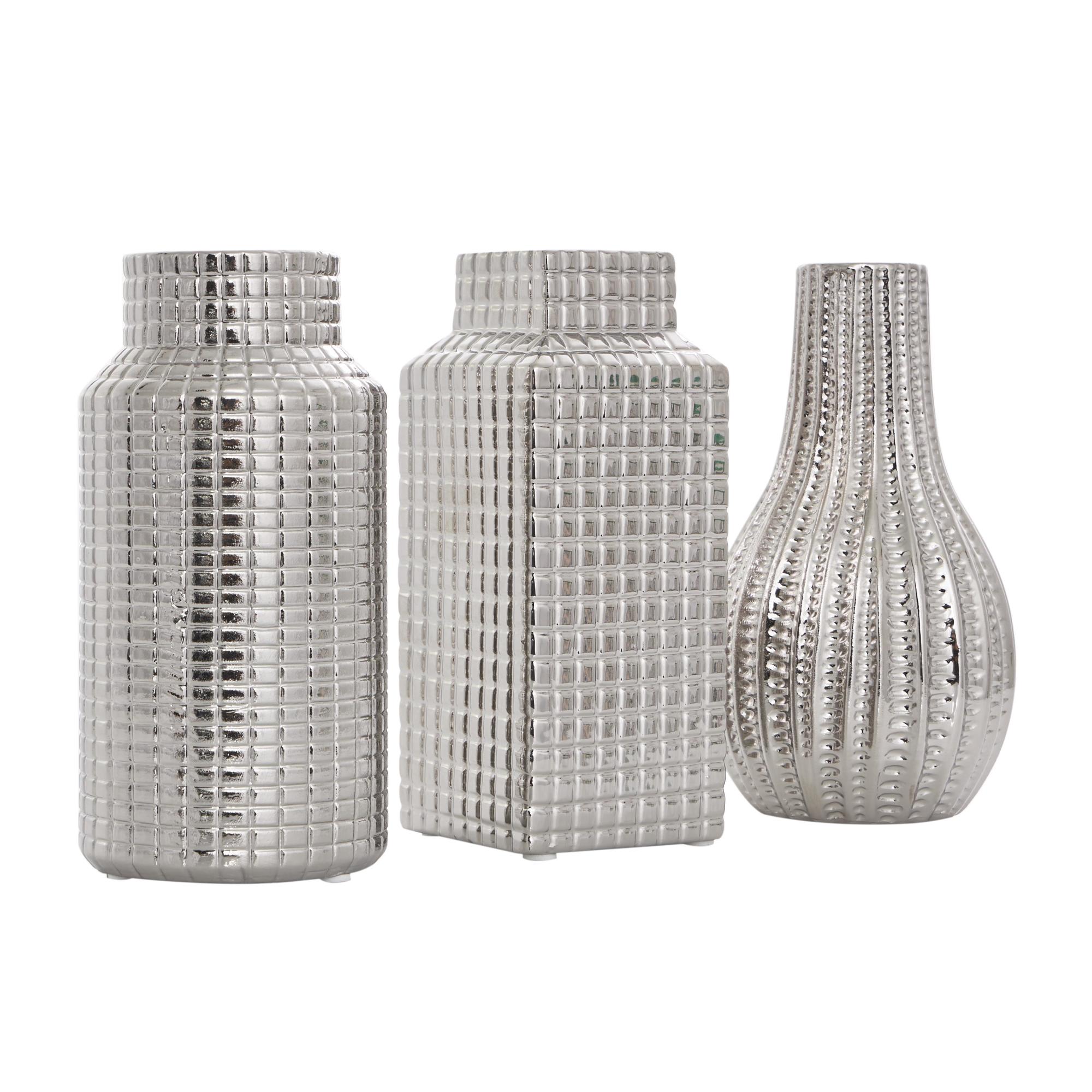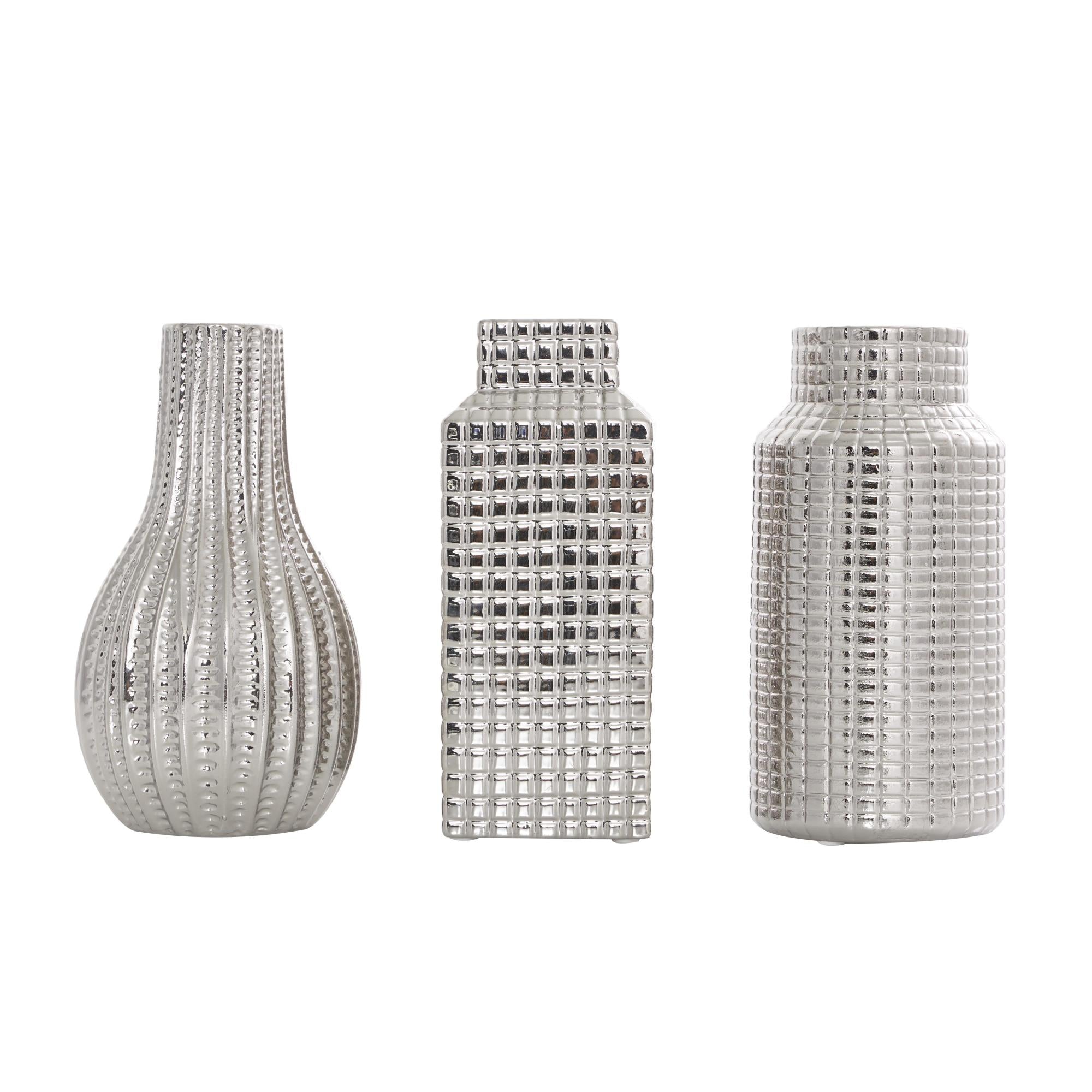 Set of 3 Geometric Ceramic Dimensional Textured Decorative Vase with Varying Shapes and Grid Patterns Set of 3 3"W, 8"H