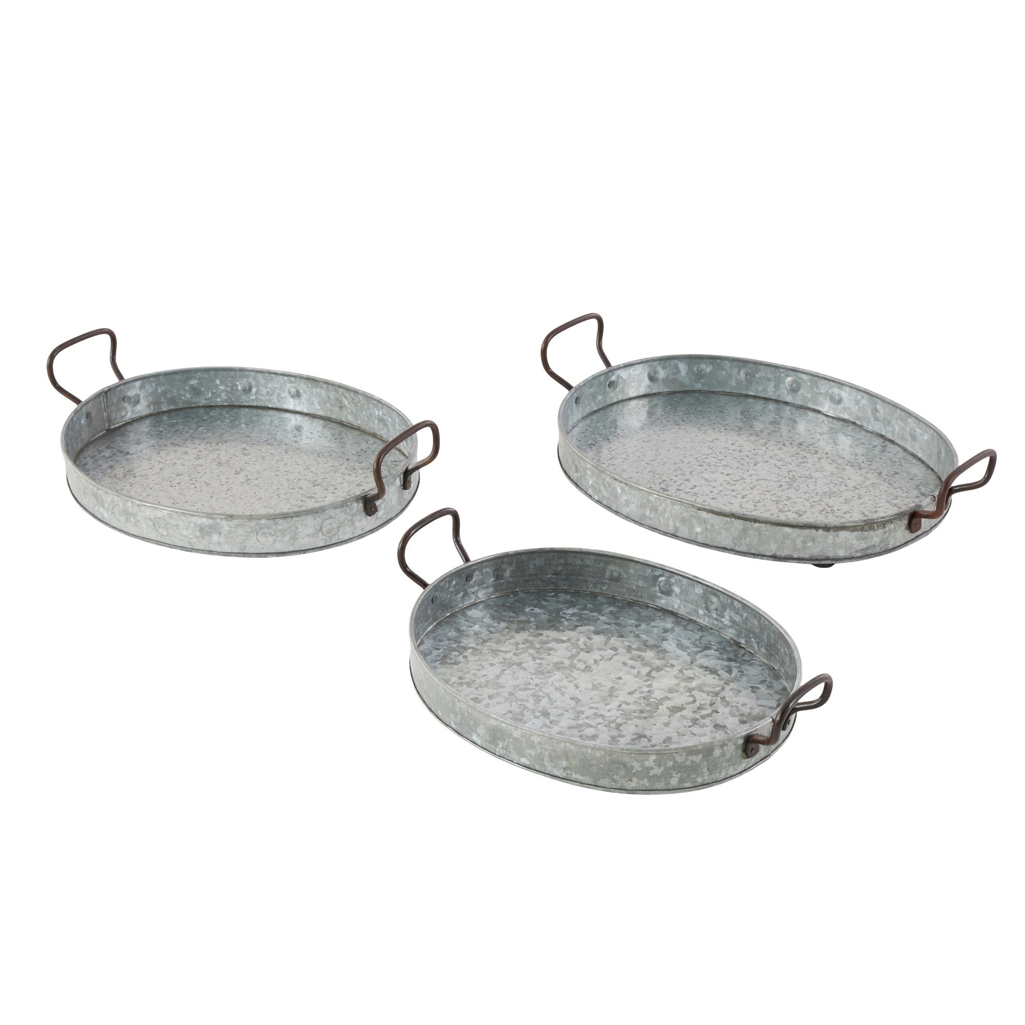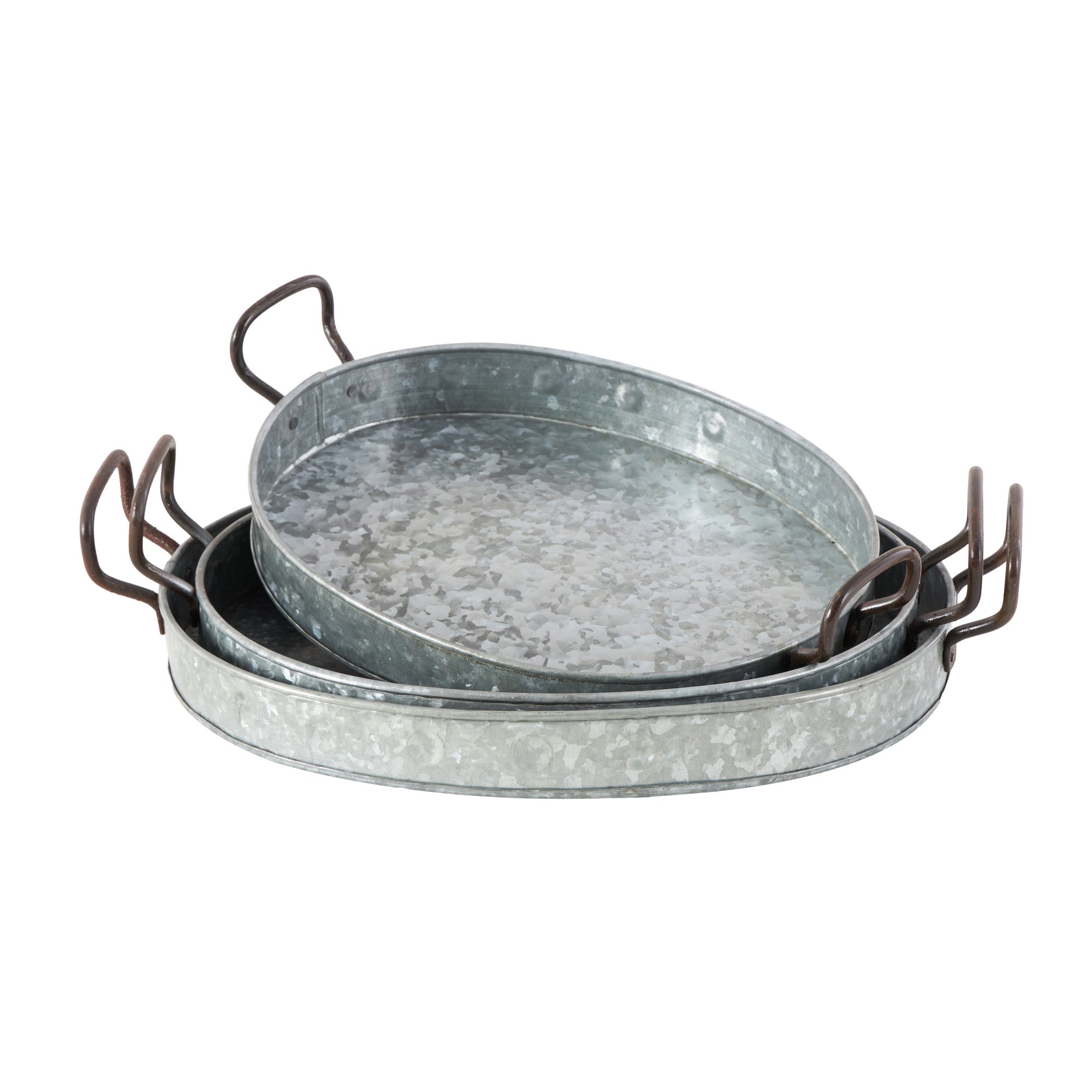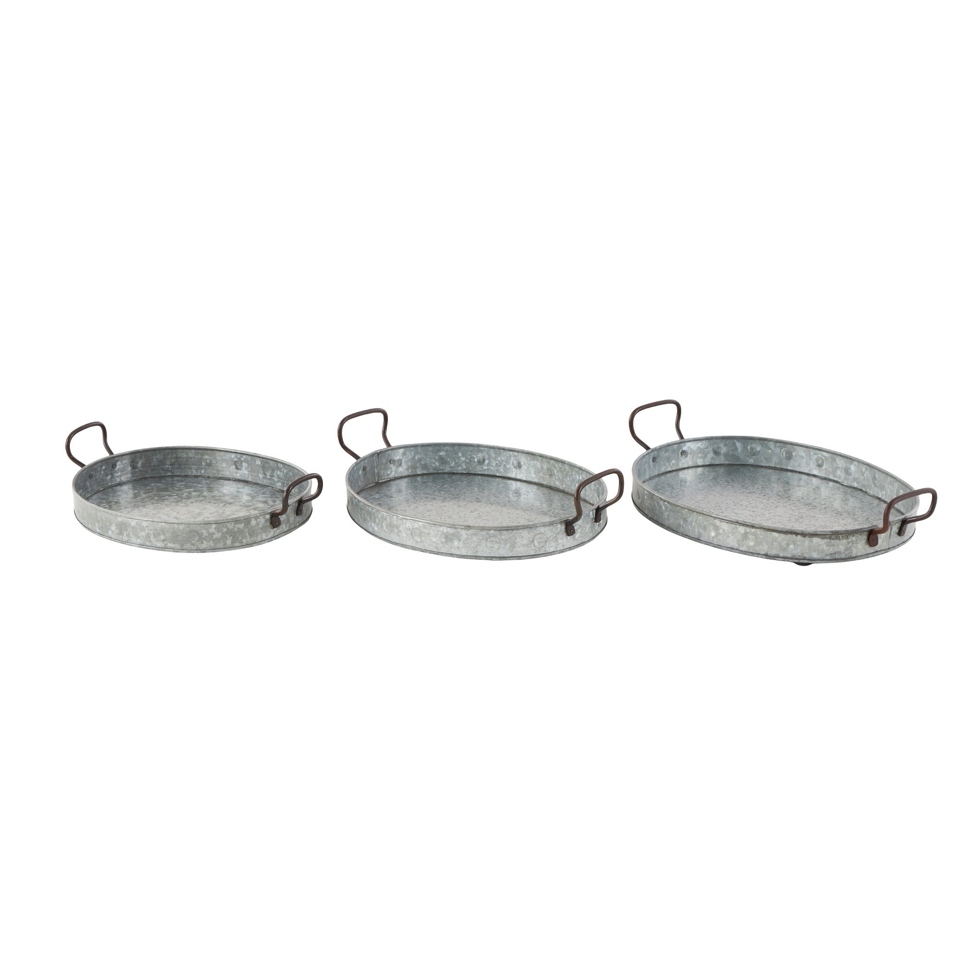Set of 3 Gray Metal Galvanized Oval Living Room Decor Tray with Rust Handles