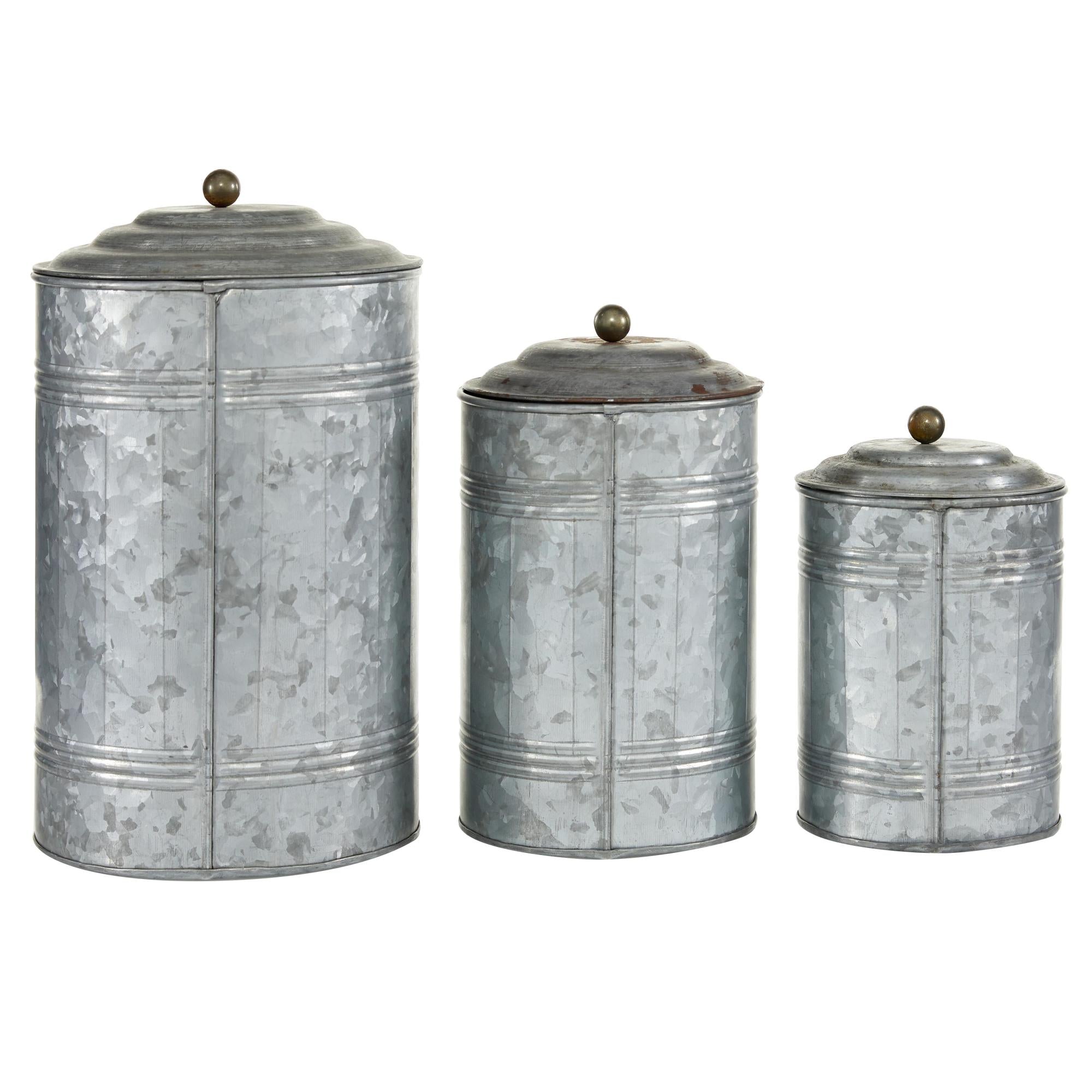 The perfect compact storage for your belongings while keeping your surface space protected. Give your surface space a finishing touch with these beautifully crafted decorative jars. This set of 3 decorative containers is perfect for enhancing your farmhouse-style kitchen decor when displayed on counters or tables. Designed with felt or rubber stoppers at the base that prevent scratching furniture and table tops, as well as sliding around. This item ships in 1 carton. Please note that this item is for decorative purposes only and is not food safe. Iron decorative jars make a great gift for any occasion. Suitable for indoor use only. This item ships fully assembled in one piece. Made in India. This iron decorative containers comes as a set of 3. Farmhouse style. Vases have 6.50 in, 5.20 in, and 4.60 in mouth openings.