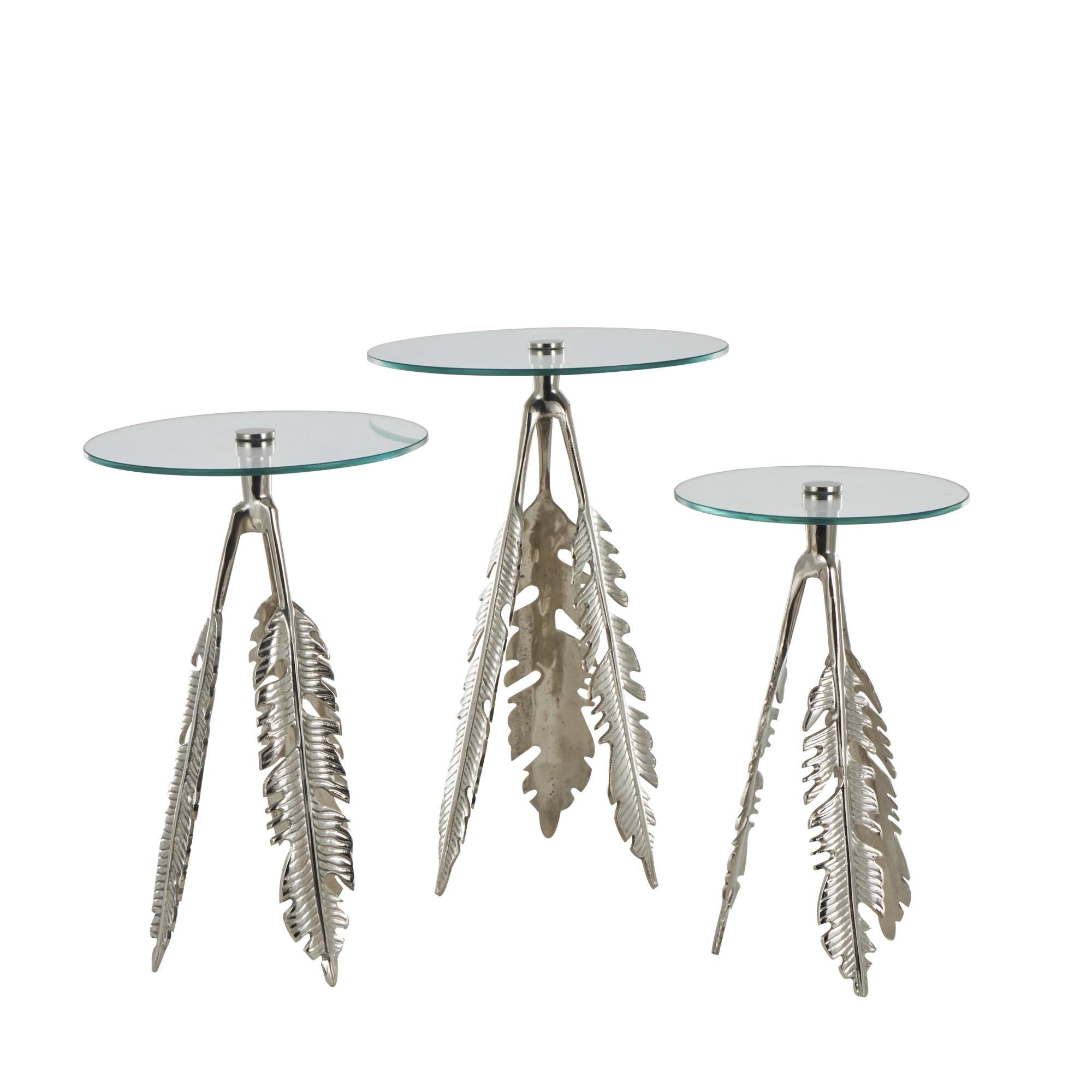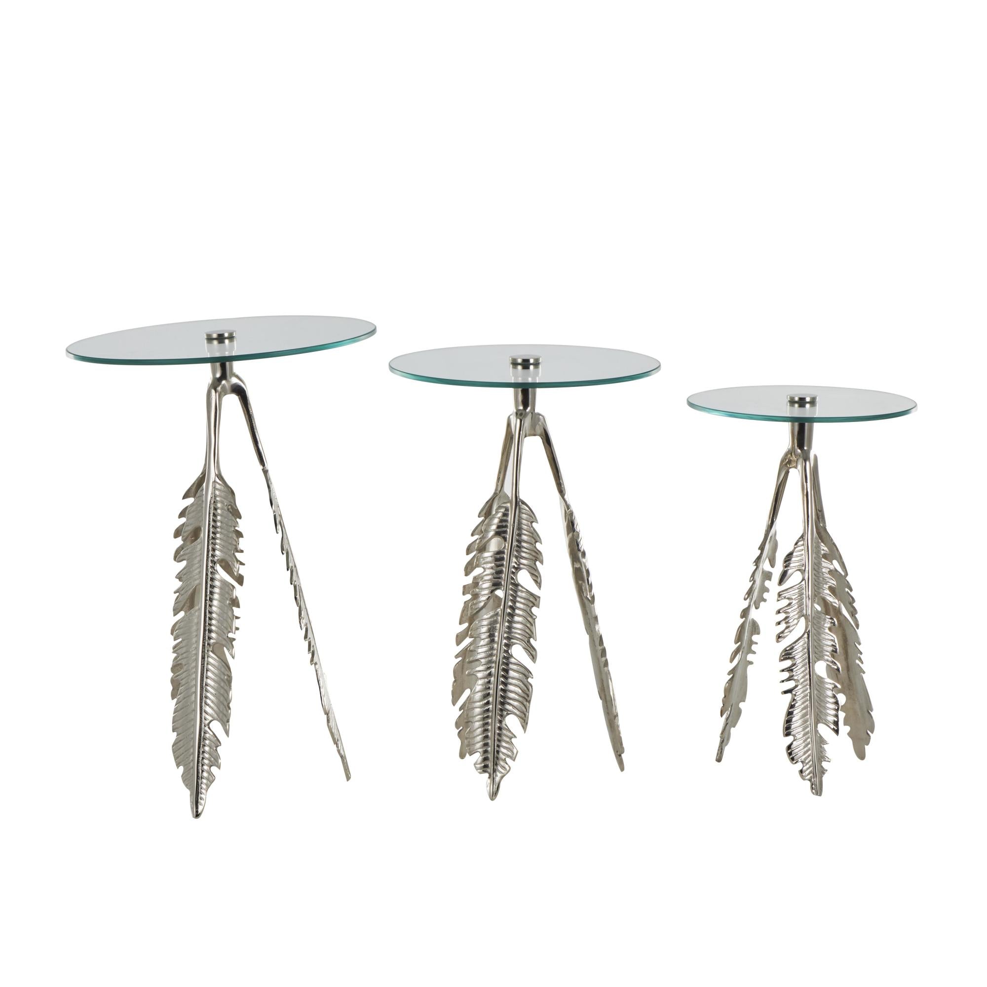 Leaf set of 3 end tables can serve as accent tables in your living room or as chic nightstands in your bedroom. This item ships in 1 carton. Suitable for indoor use only. This item ships fully assembled in one piece. Maximum weight limit is 50 lbs. Made in India. This aluminum end table comes as a set of 3. Eclectic style.