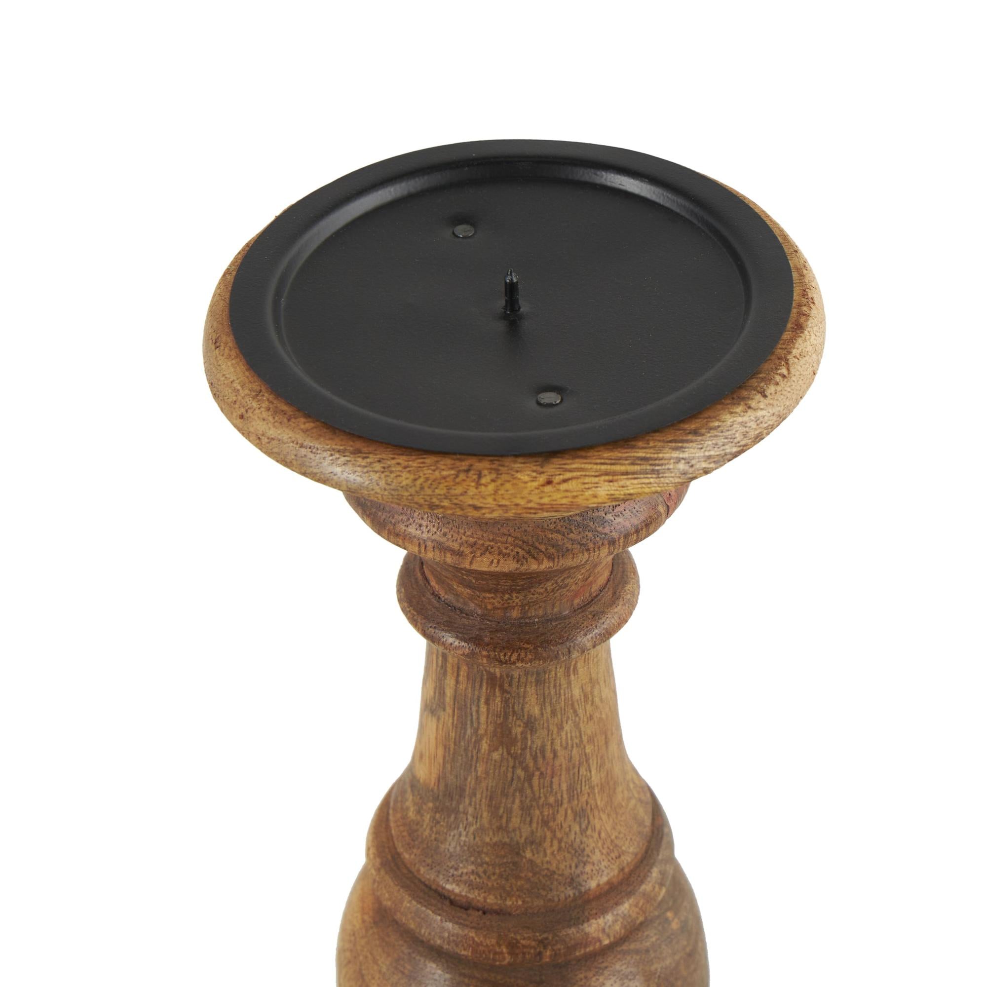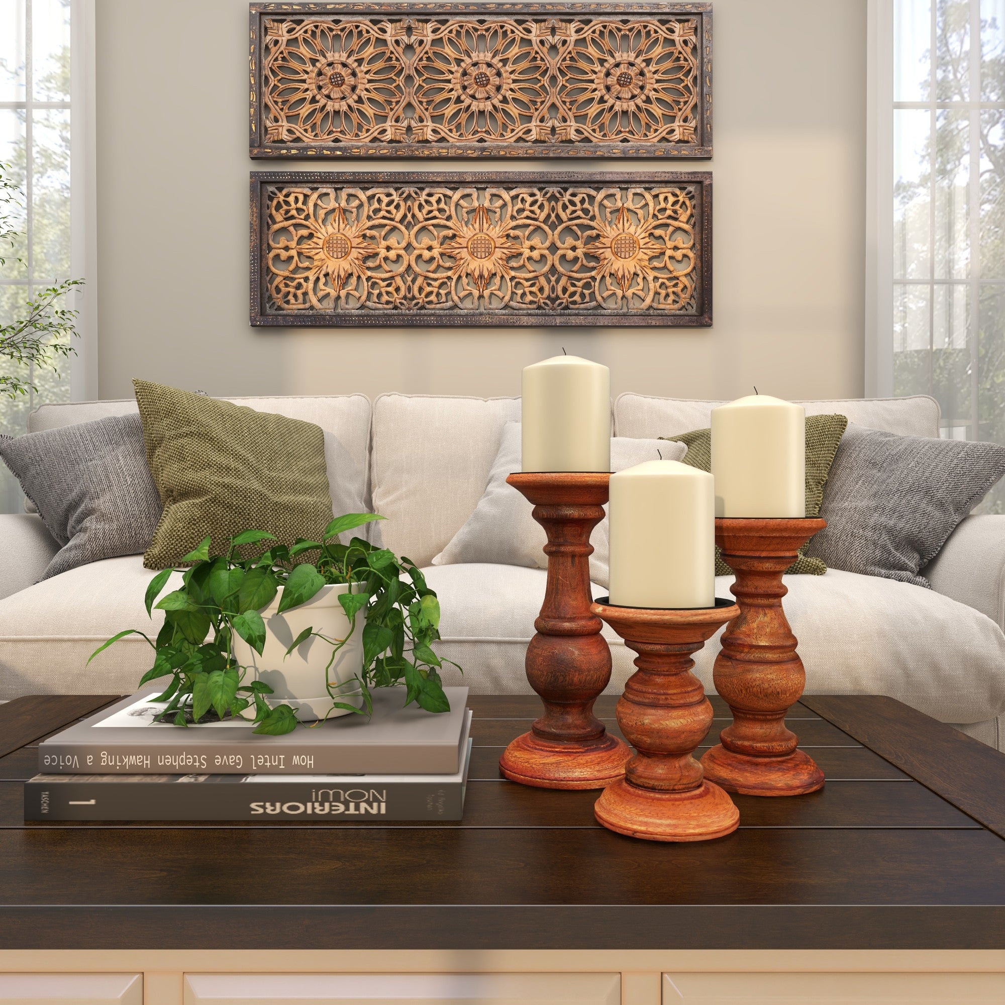 Give your space a radiant illumination with these beautifully crafted candle holders. Made with a sturdy base, it is perfect for creating an elegant atmosphere at your table top or mantel. Perfect for living rooms, this set of 3 candle stand can elevate your decor while providing a functional centerpiece. Designed with felt or rubber stoppers at the base that prevent scratching furniture and table tops, as well as sliding around. Can hold 3 pillar candles, not included. This item ships in 1 carton. Mango wood candle holder makes a great gift for any occasion. Suitable for indoor use only. This item ships fully assembled in one piece. Made in India. This mango wood candle stand comes as a set of 3. Traditional style.