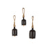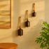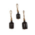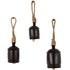 •This rustic set of 3 decorative bells for home decor is welded from iron, painted in black, with a mango wood carved clapper placed inside, and a jute rope attached to the top, showcasing high level craftsmanship