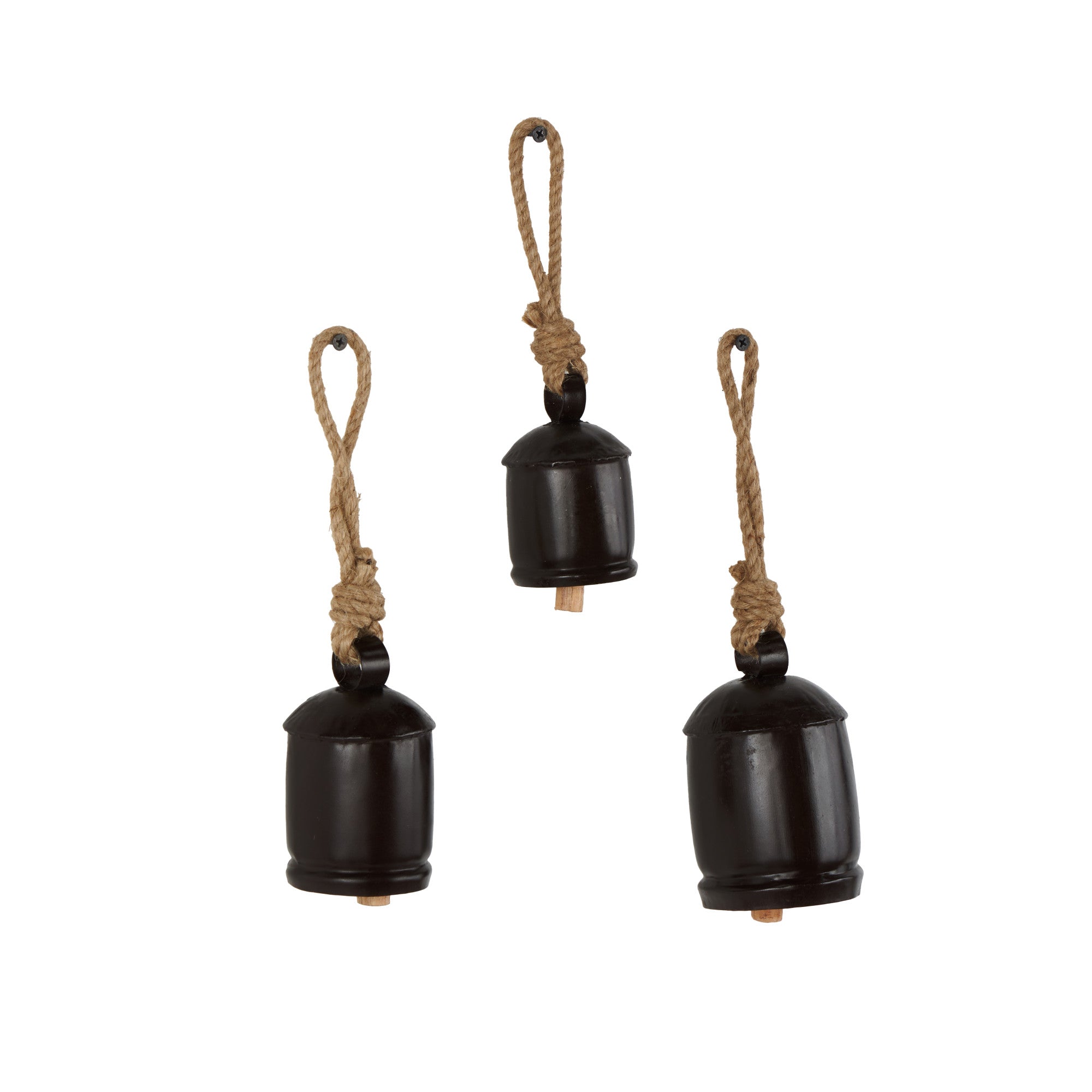 Set of 3 Metal Tibetan Inspired Indoor Outdoor Decorative Cow Bells with Jute Hanging Rope