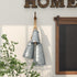 •The rustic set of 3 decorative bells for home decor features sturdy iron molded into cone shapes with ring hangers on top and tied with jute rope, with carved wood clappers attached to the interior
