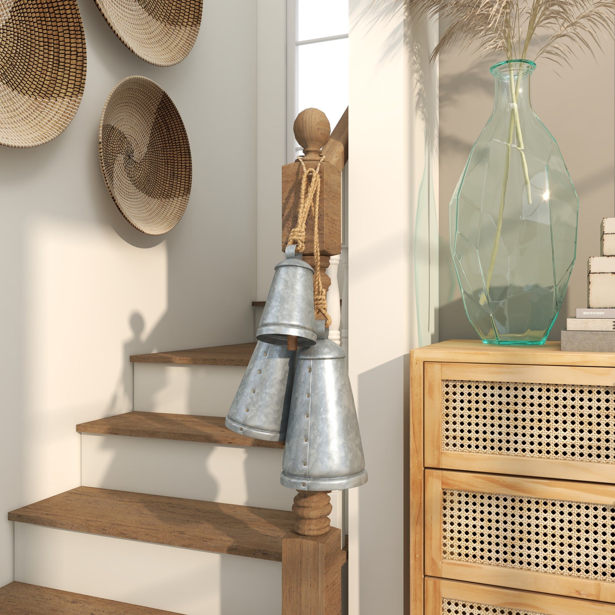 •The metal set of 3 decorative cow bells boasts various-sized pieces in an elegant color that can be hung through a jute rope, adding dimension to your space