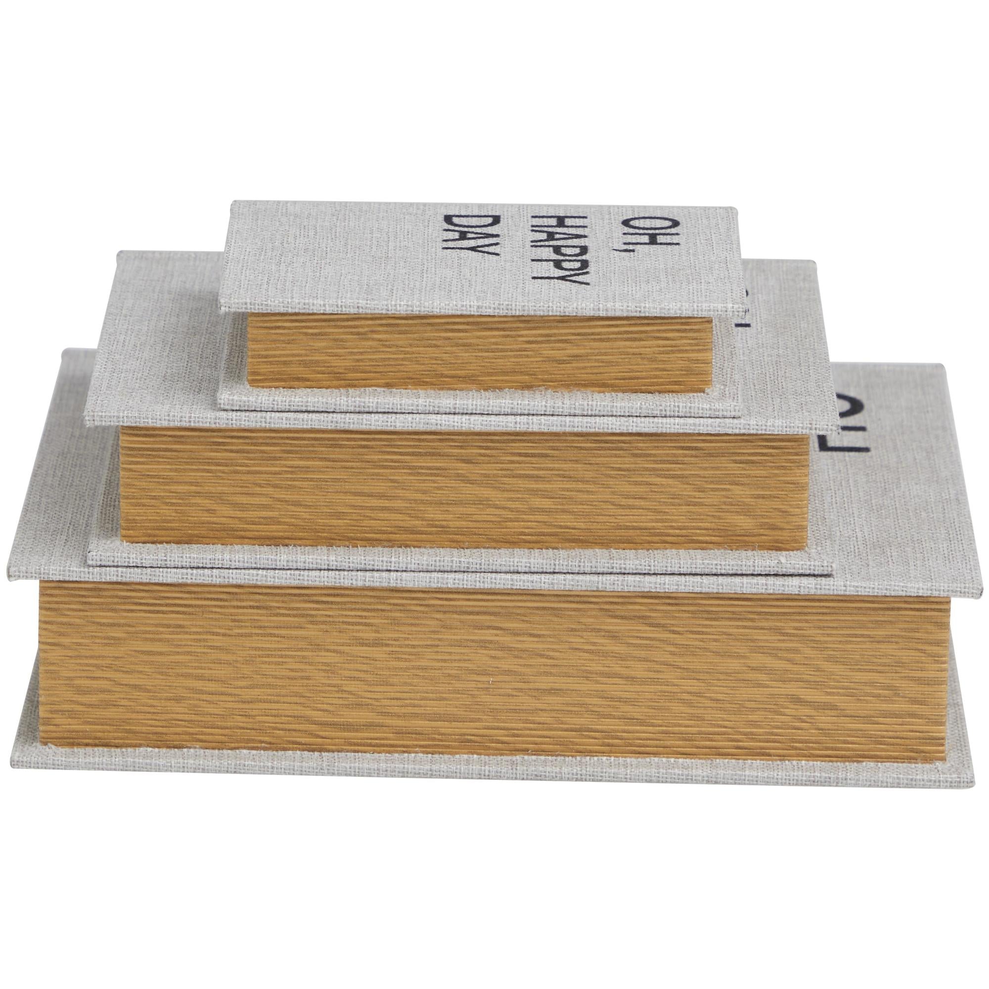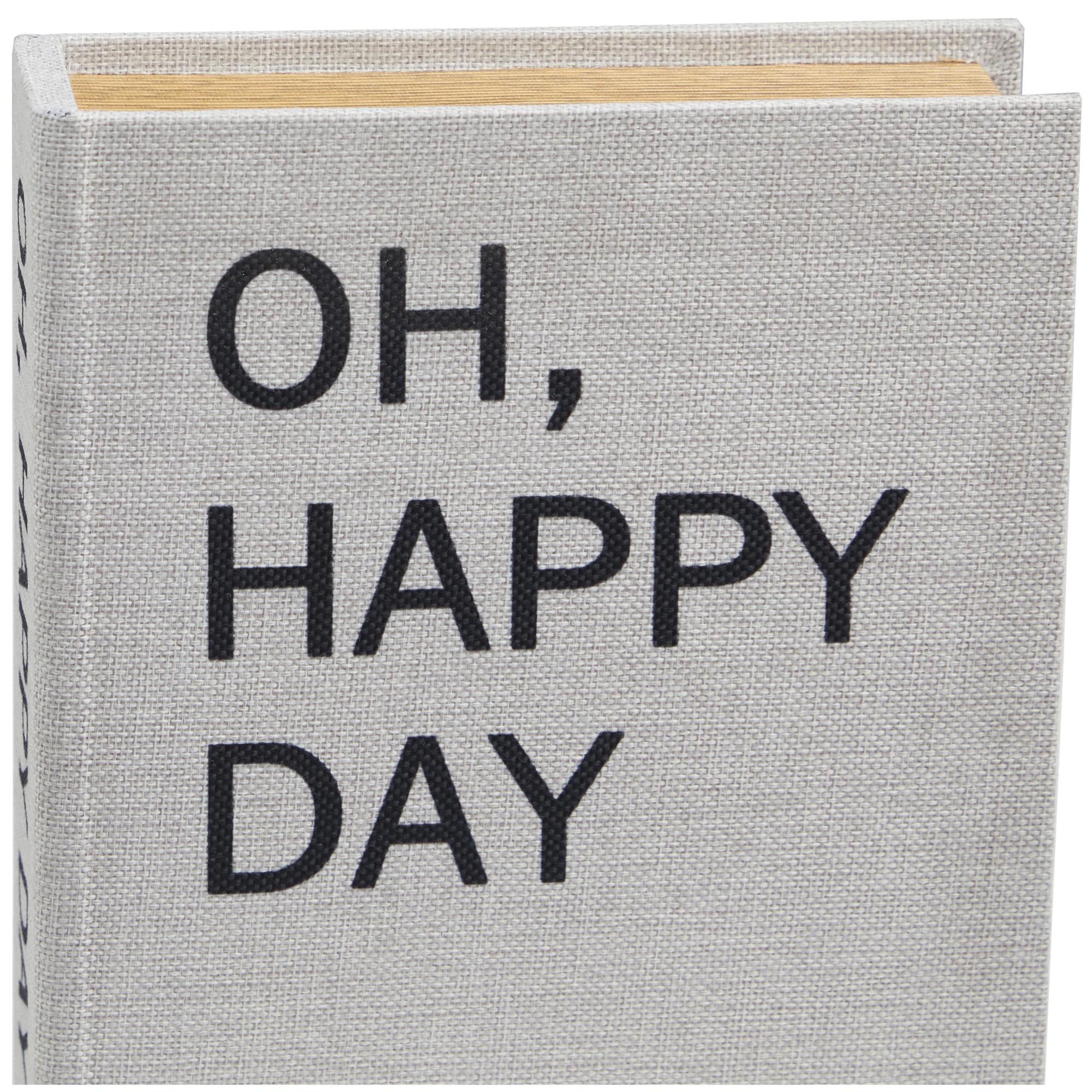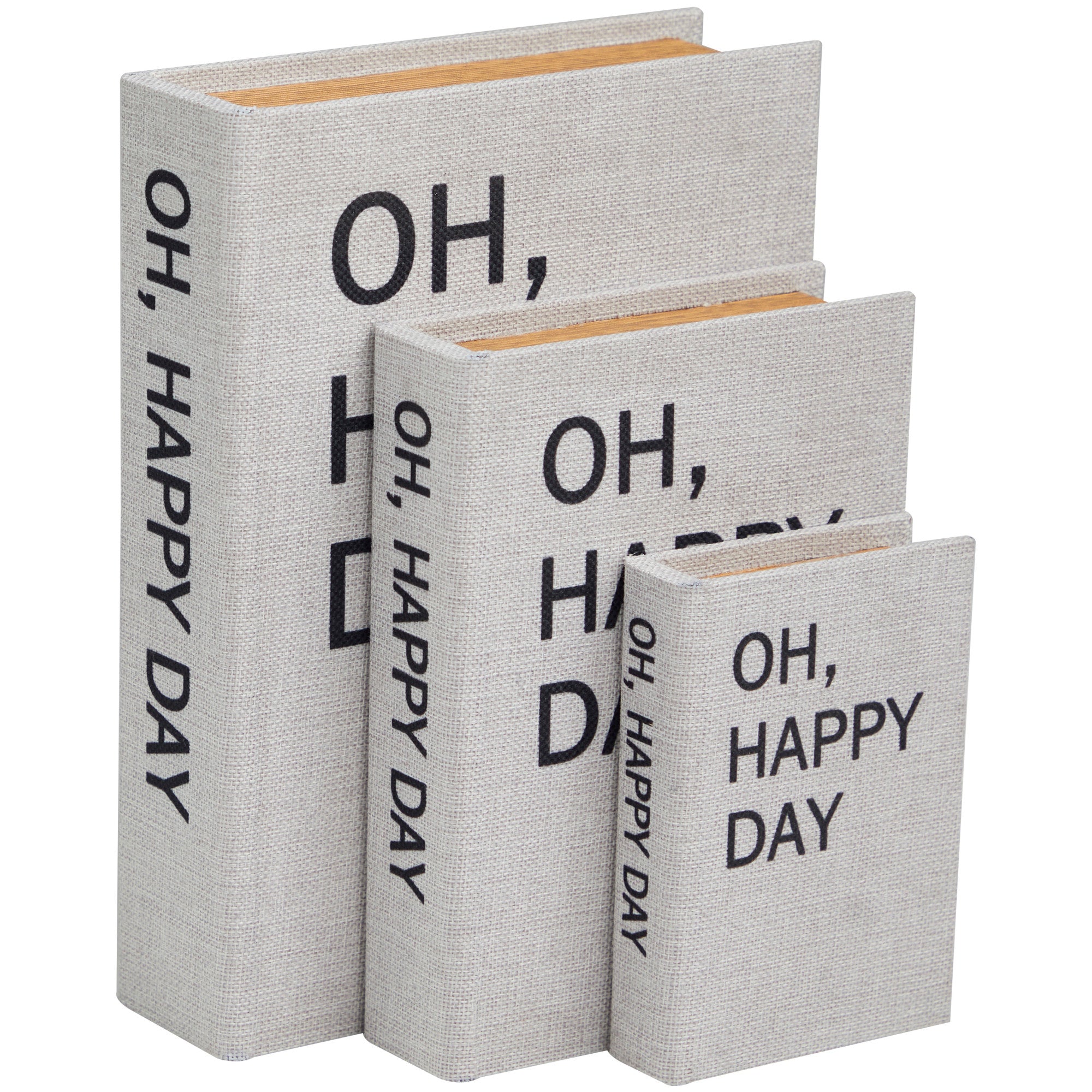 A perfect way to add depth and texture to your surface space with these discreet box. Give your surface space a finishing touch with these beautifully crafted decorative boxes. This set of 3 book shaped boxes can be used to elevate the visual aesthetic of any room, whether placed on bookshelves or consoles. This item ships in 1 carton. Linen box makes a great gift for any occasion. Suitable for indoor use only. This item ships fully assembled in one piece. Made in India. This linen book shaped box comes as a set of 3. Modern style. Book set features the words "OH, HAPPY DAY" on the front cover and along the spine.