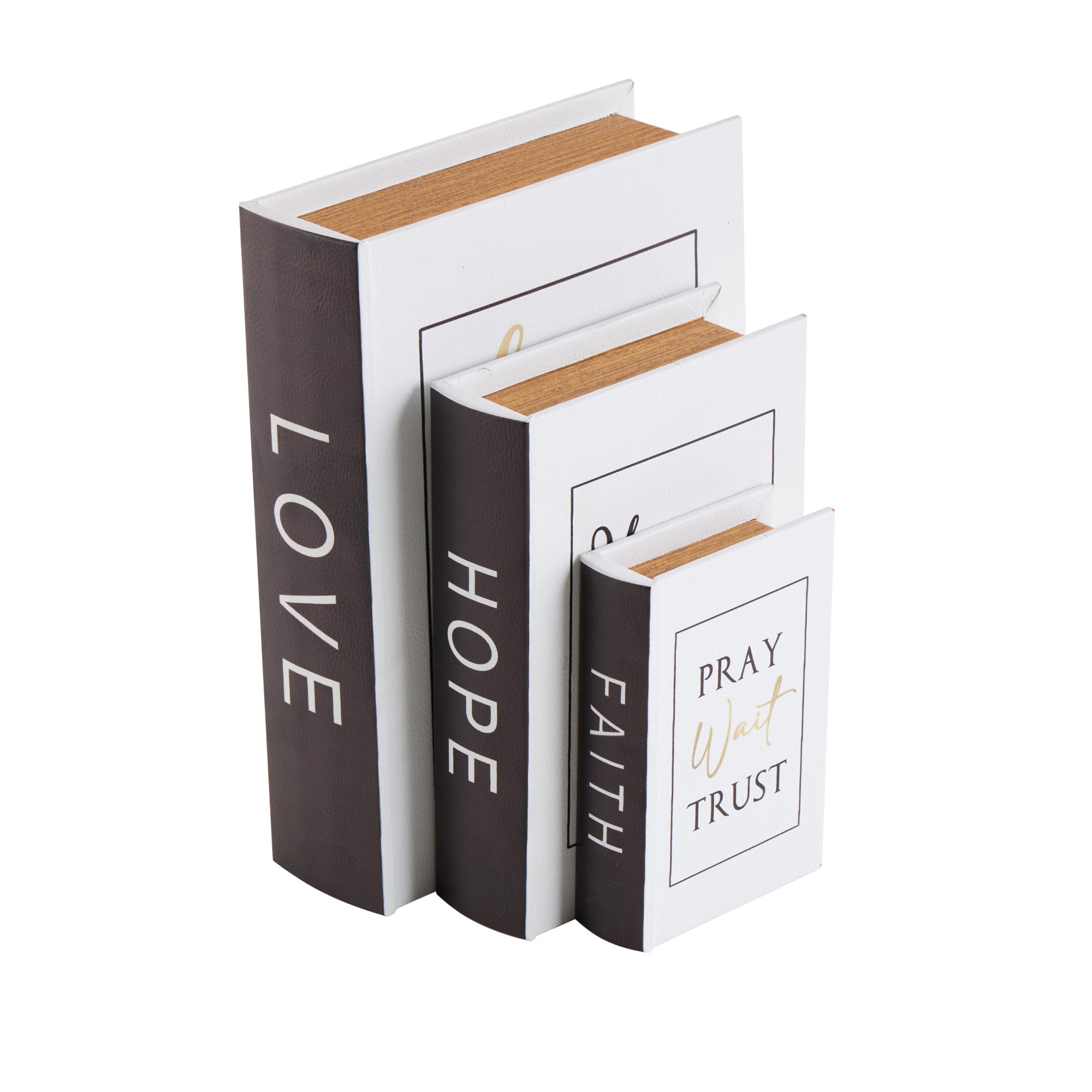 This set of 3 book shaped boxes, adorned with simplistic "LOVE," "HOPE," "PRAY" typography, can elevate the visual aesthetic of any space, creating height on bookshelves and consoles. This item ships in 1 carton. Faux leather box makes a great gift for any occasion. Suitable for indoor use only. This item ships fully assembled in one piece. This faux leather book shaped box comes as a set of 3. Modern style. Each book has either "LOVE", "HOPE", or "FAITH" on the spine, and "Pray Wait Trust"" on the front.