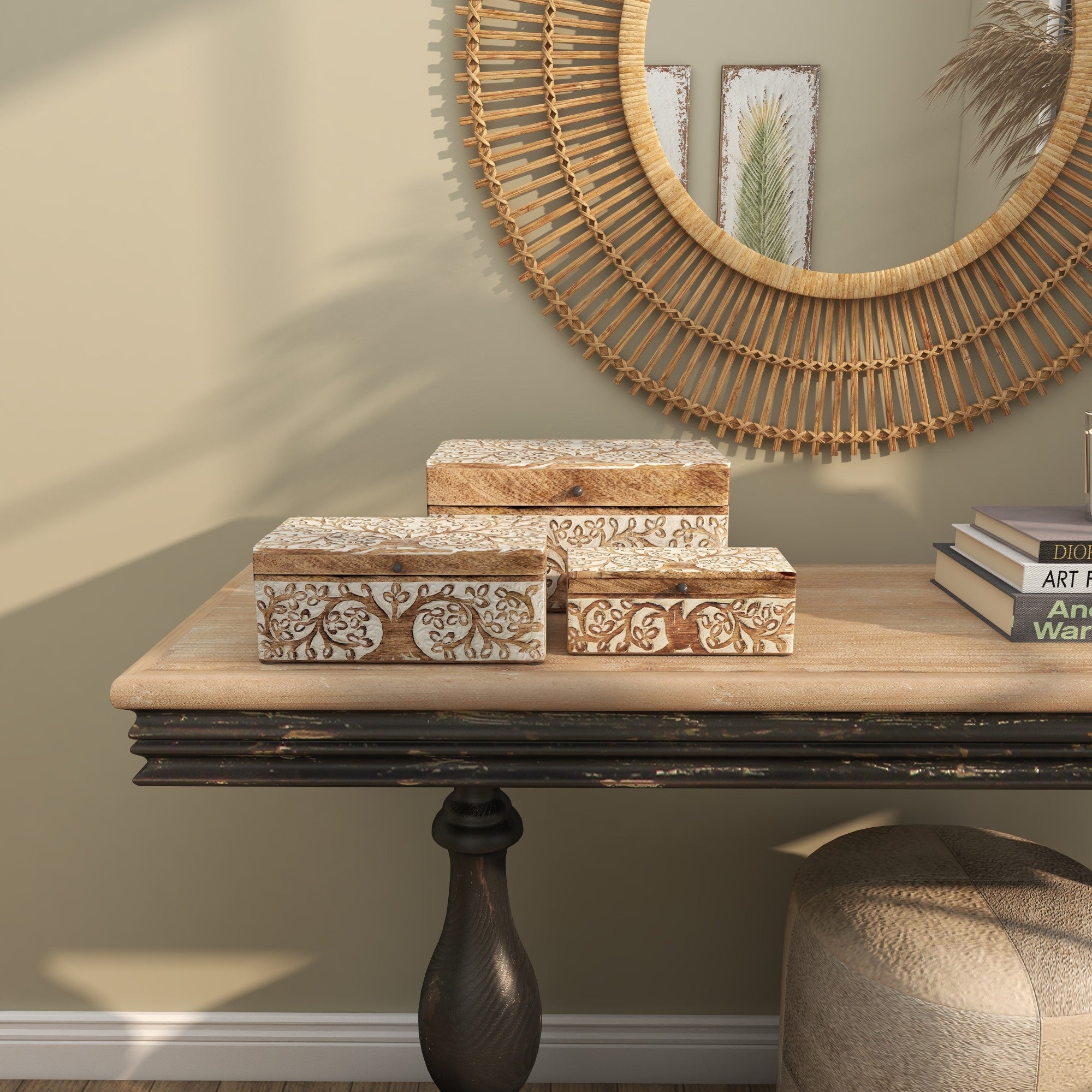 •Crafted from solid mango wood, this decorative box set exudes a rustic charm